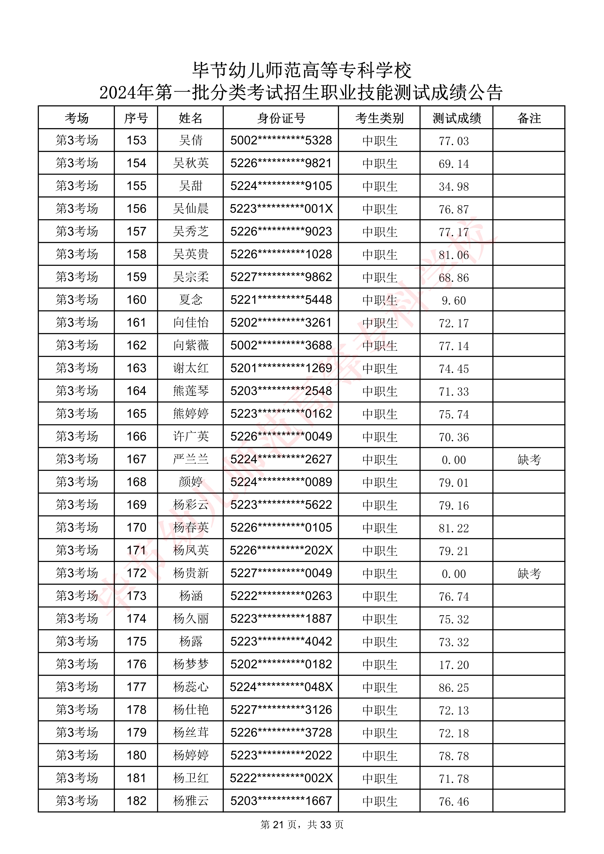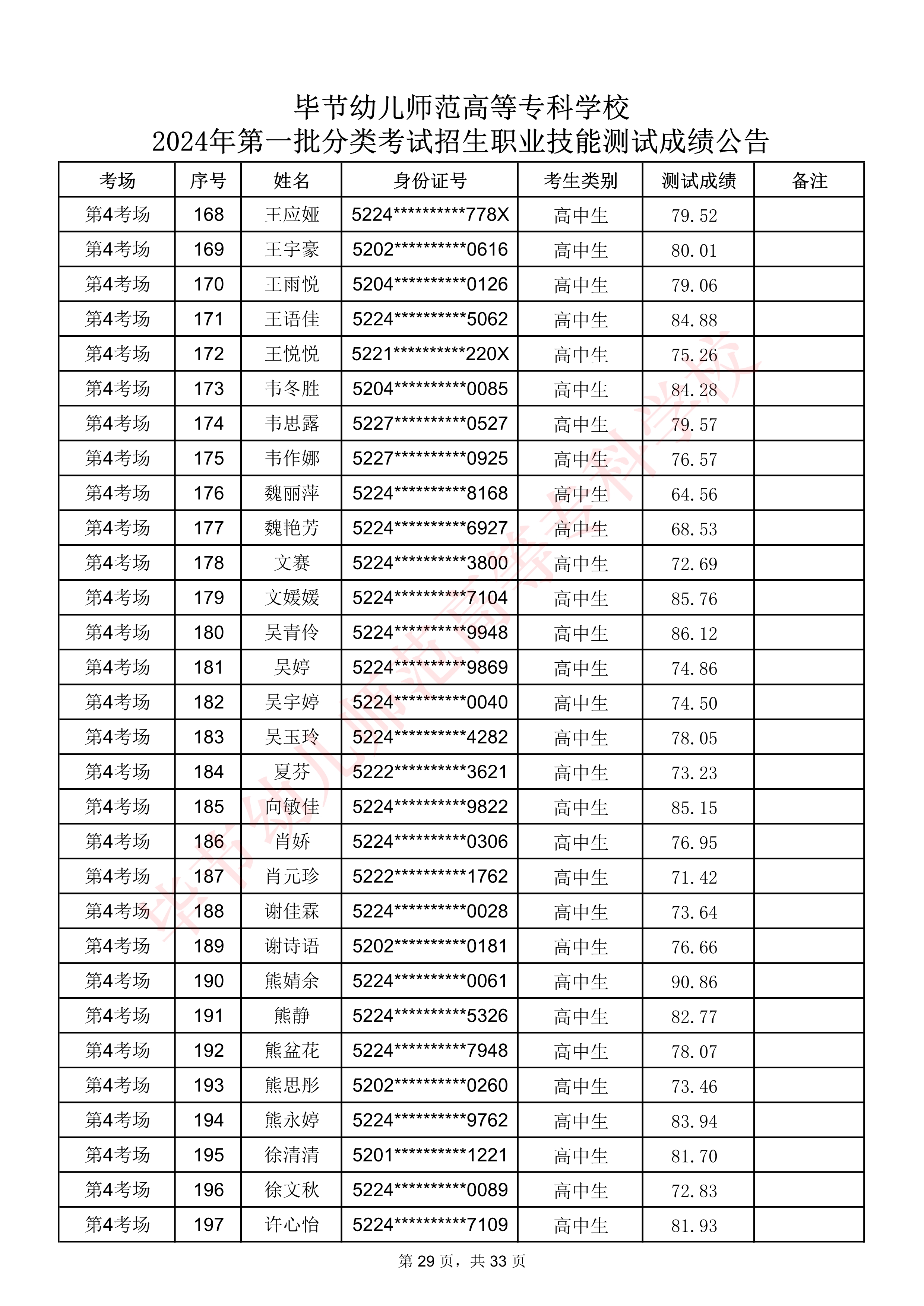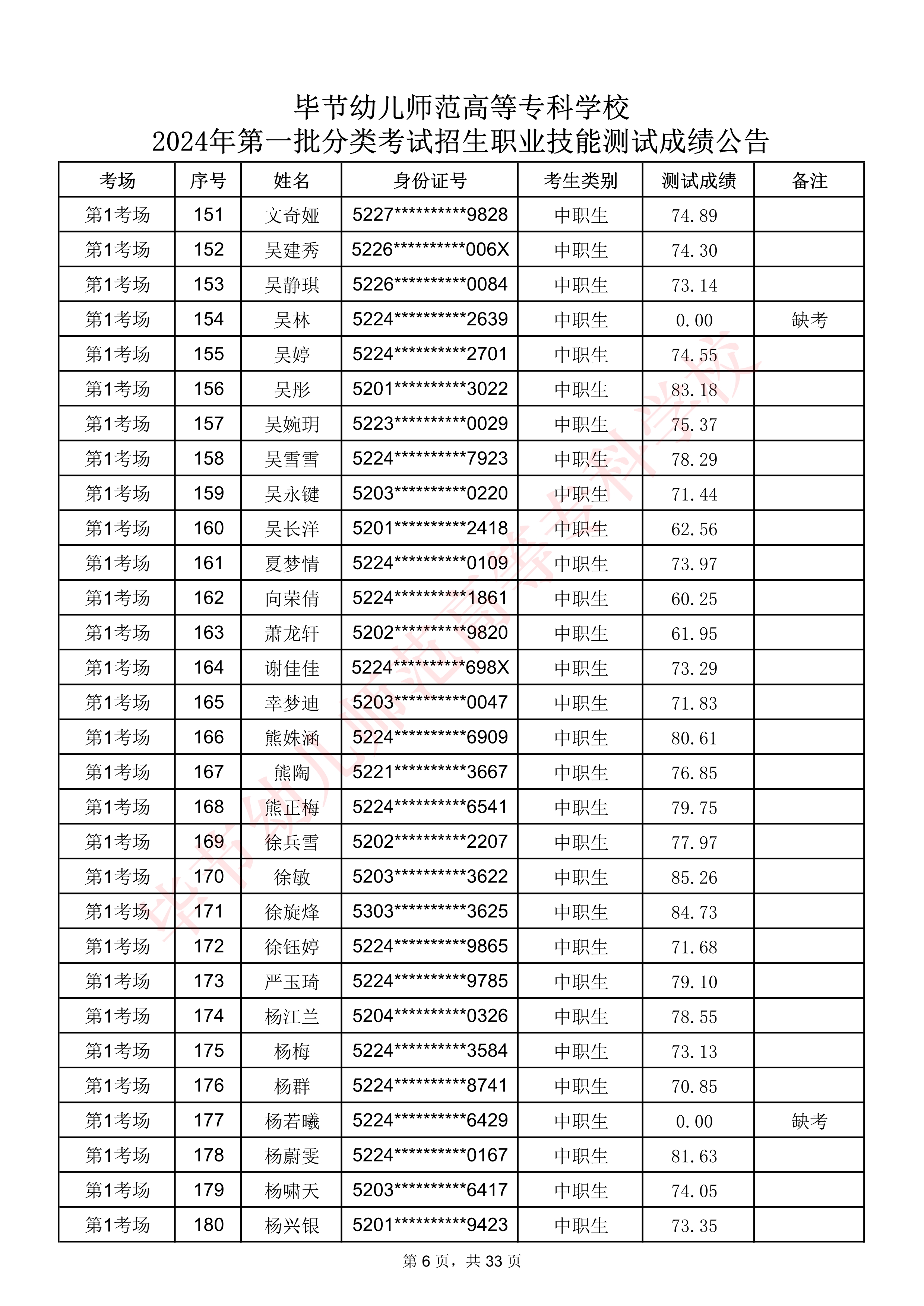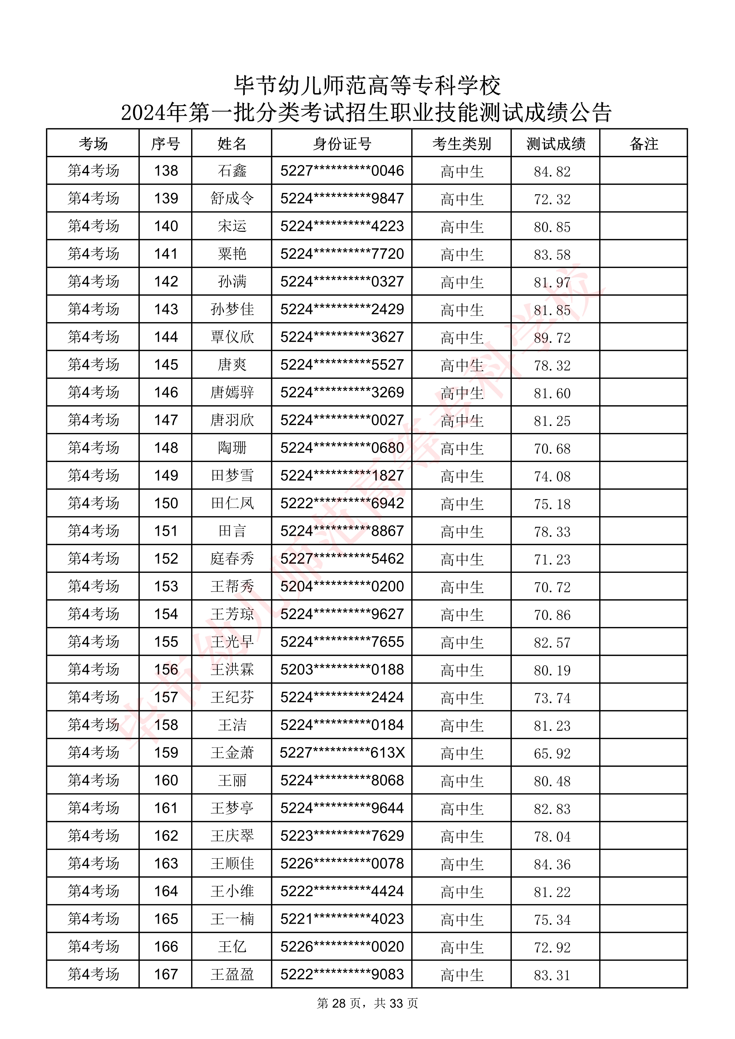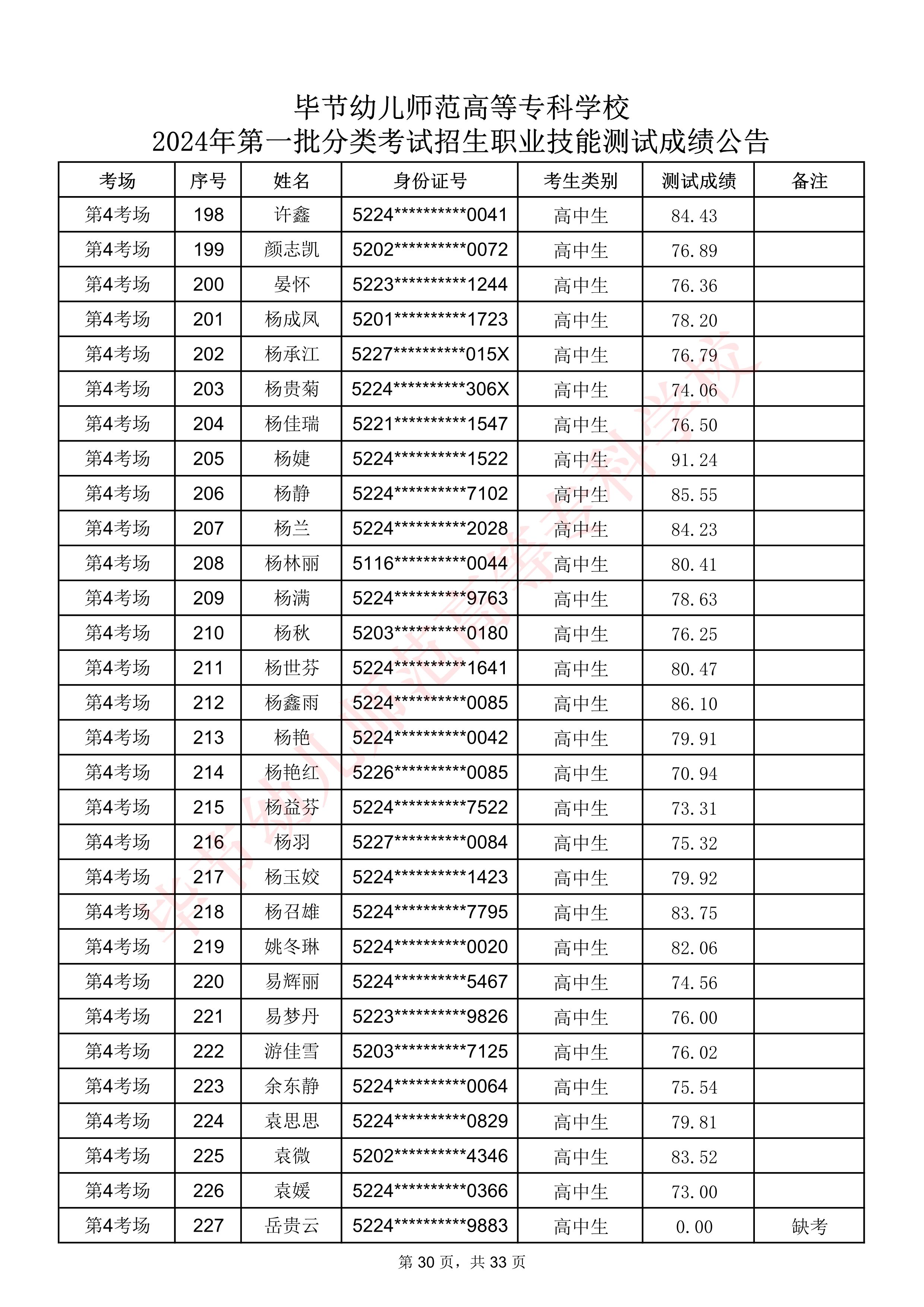 毕节幼儿师范高等专科学校2024年第一批分类考试招生职业技能测试成绩公告
