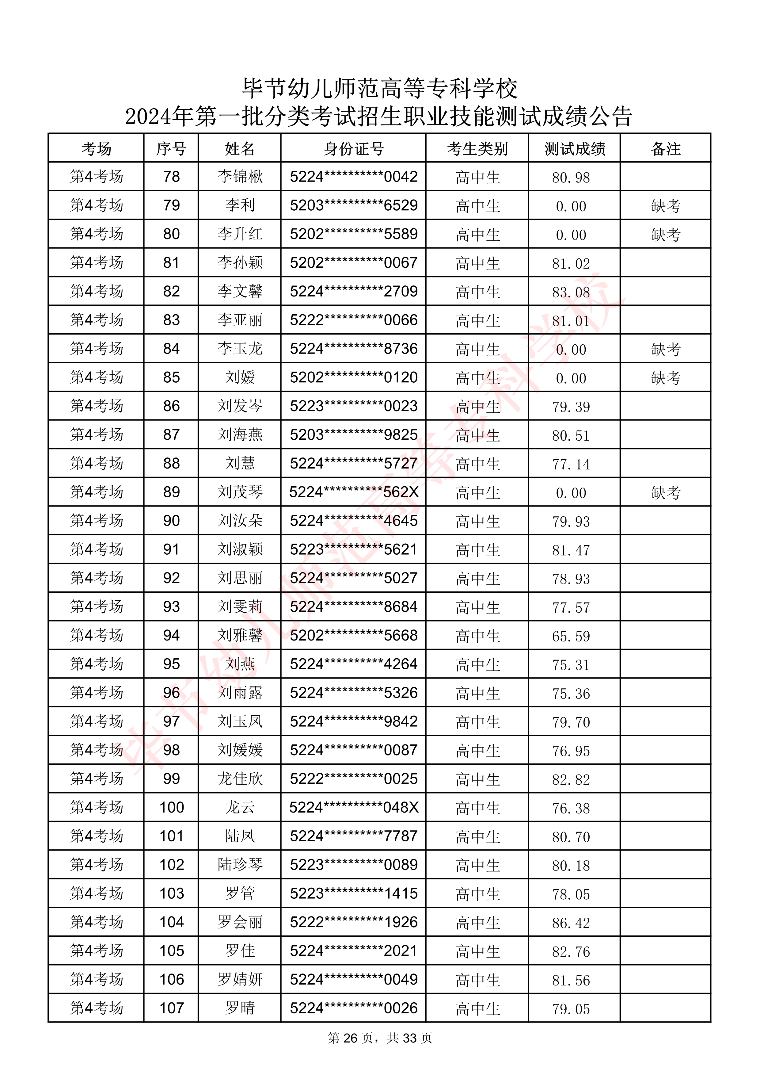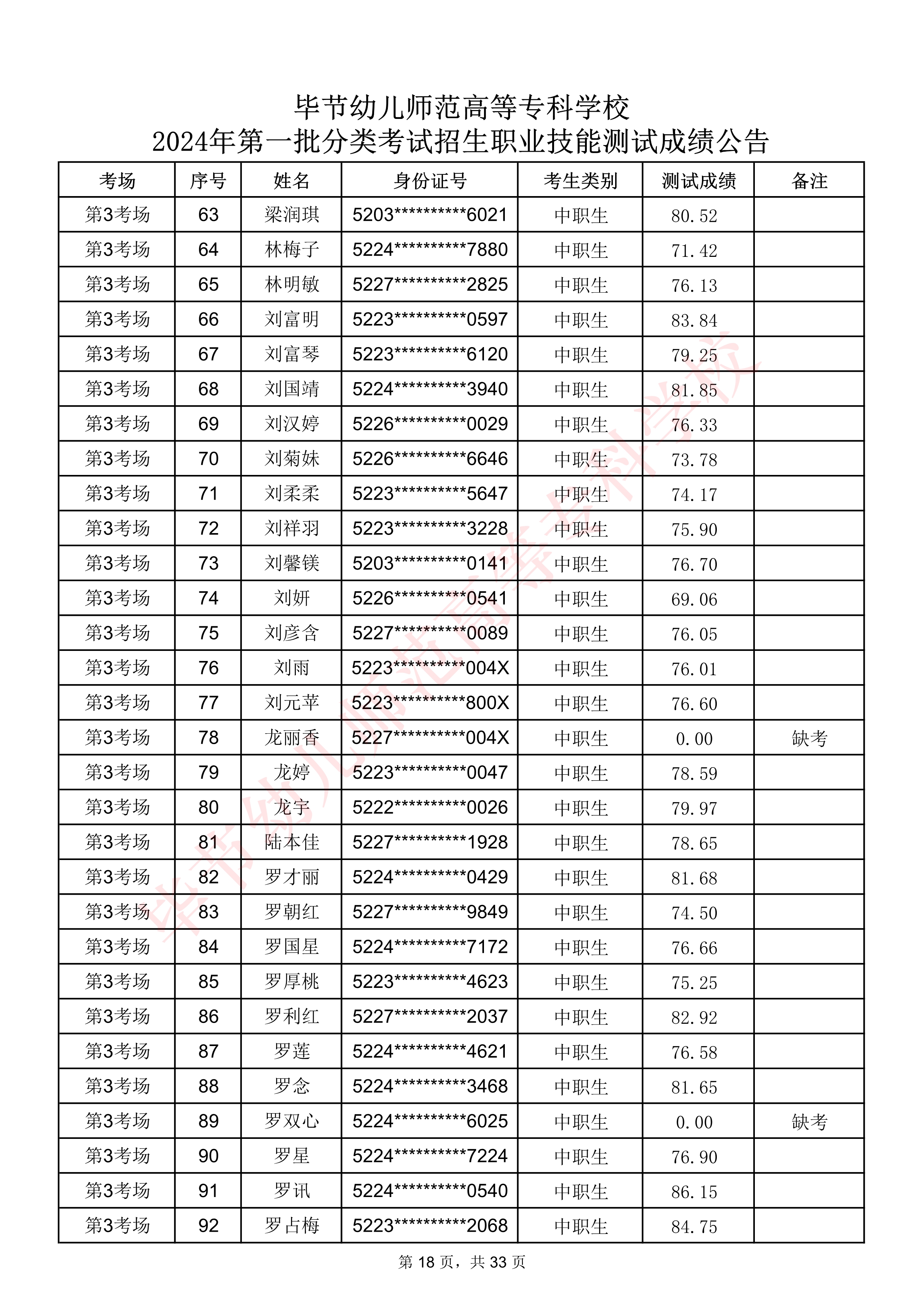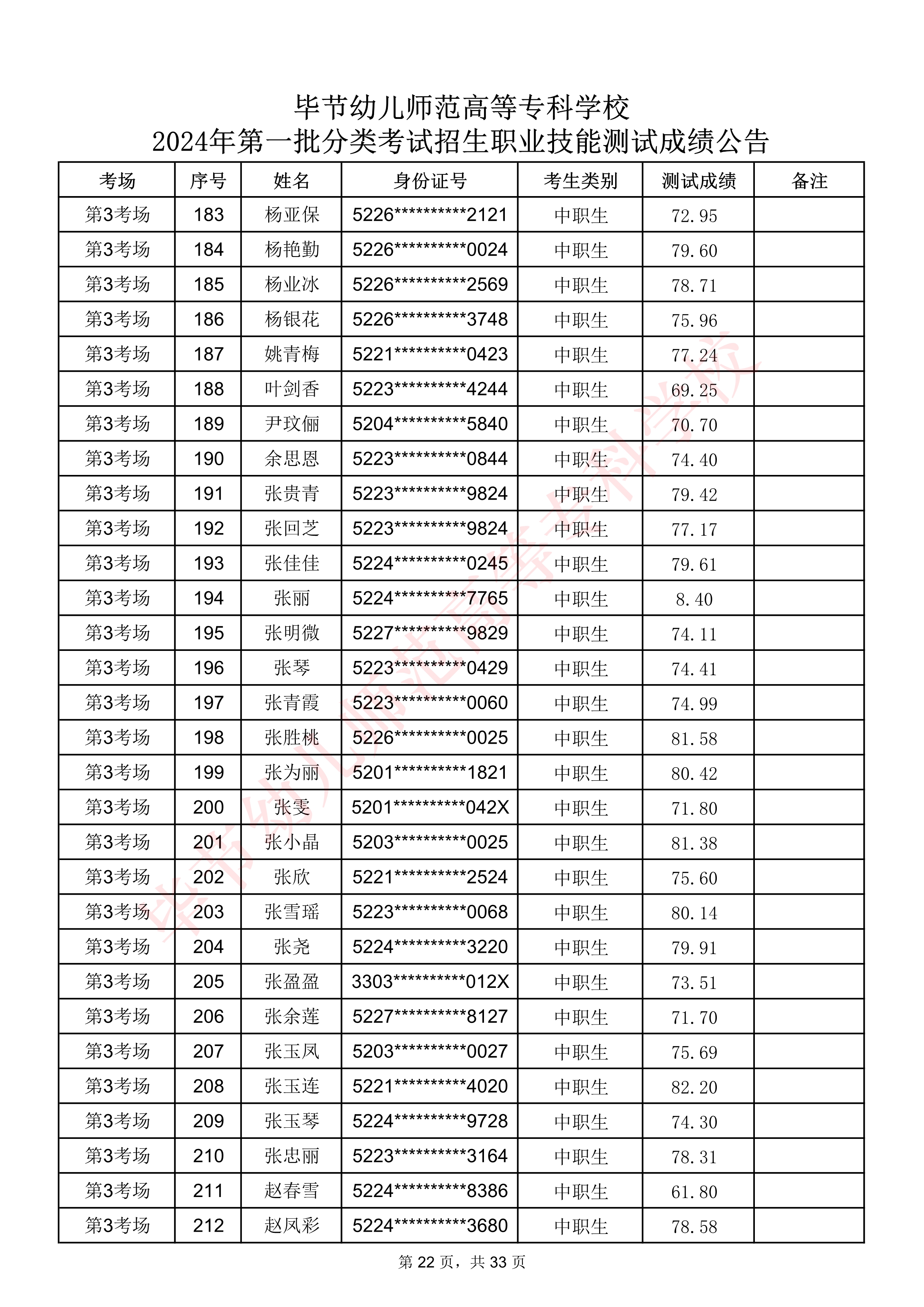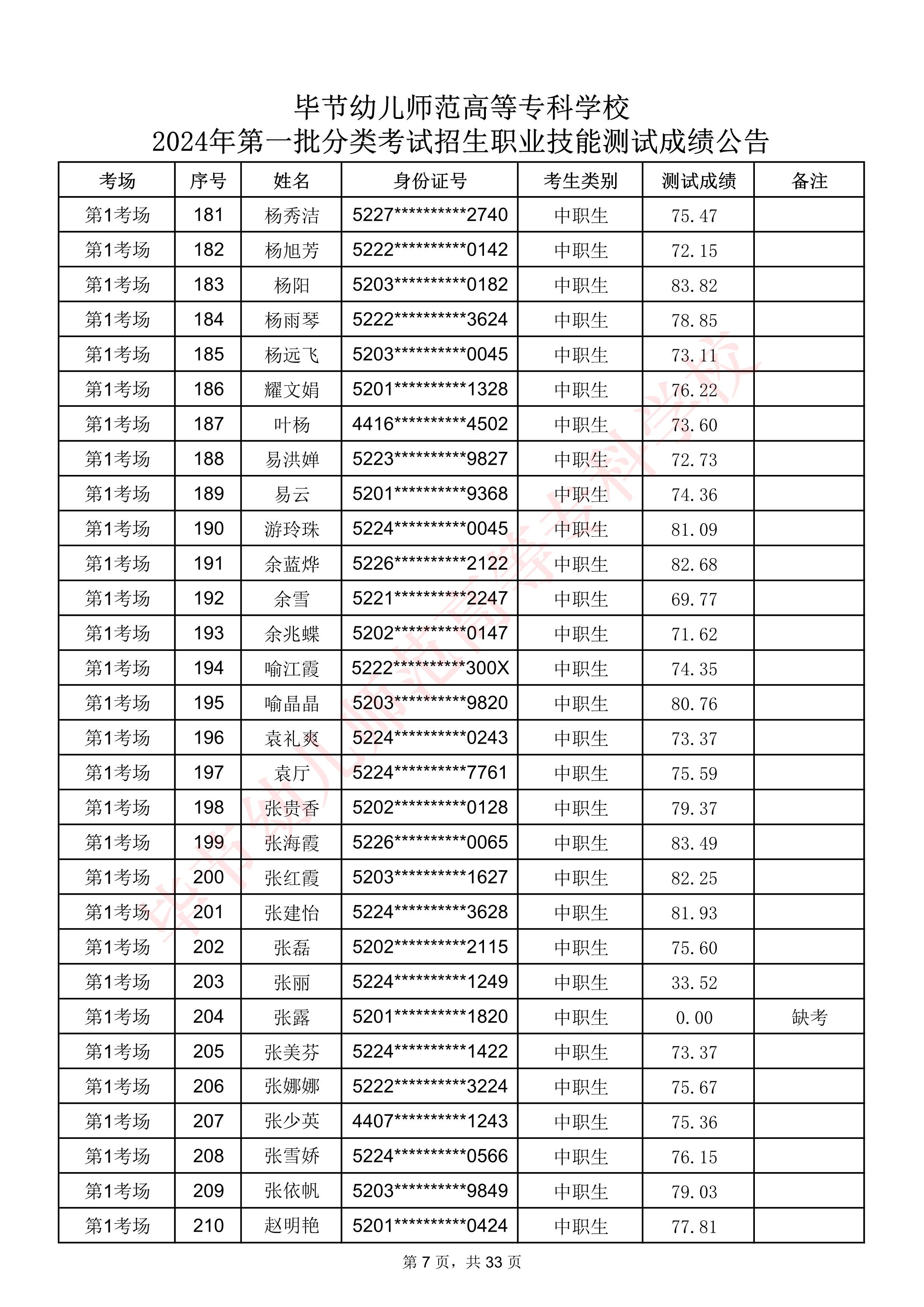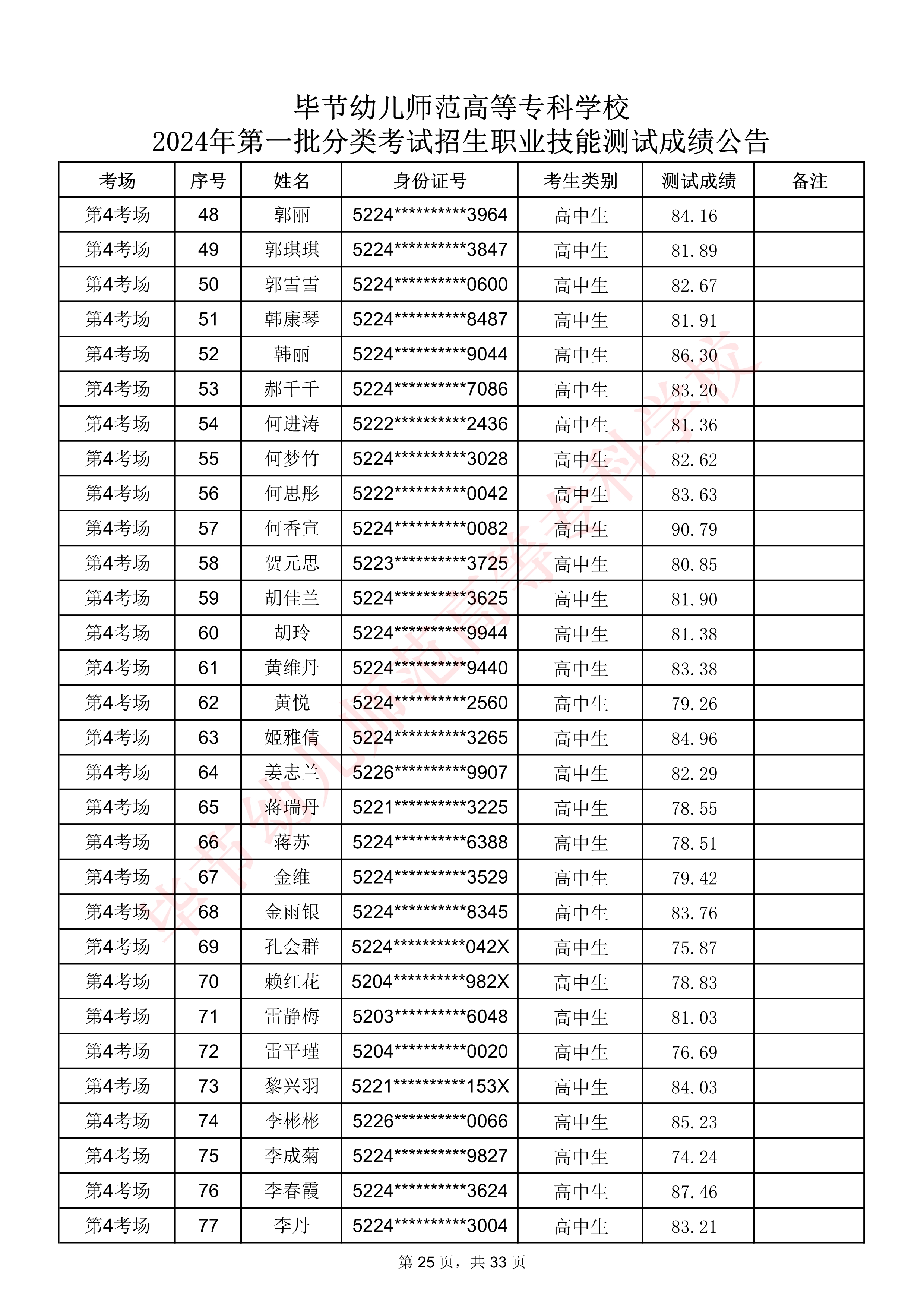 毕节幼儿师范高等专科学校2024年第一批分类考试招生职业技能测试成绩公告