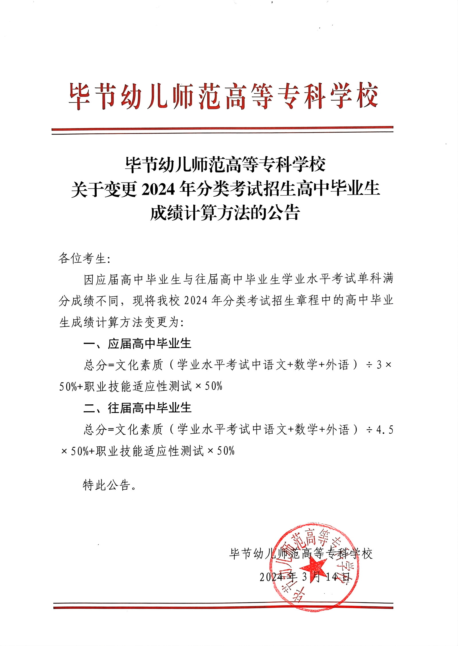 毕节幼儿师范高等专科学校关于变更2024年分类考试招生高中毕业生成绩计算方法的公告