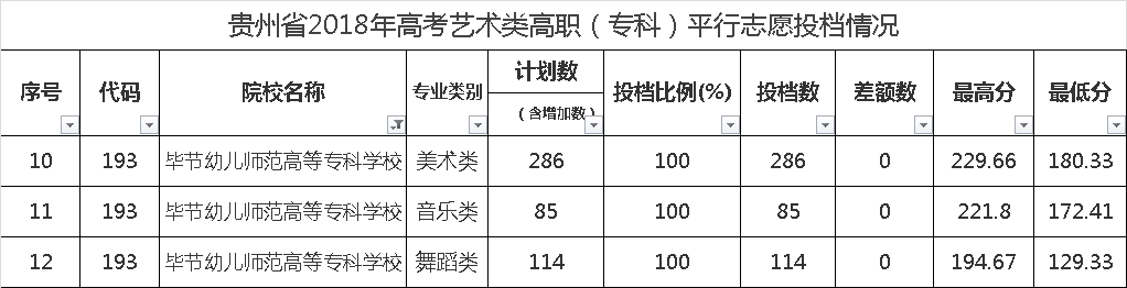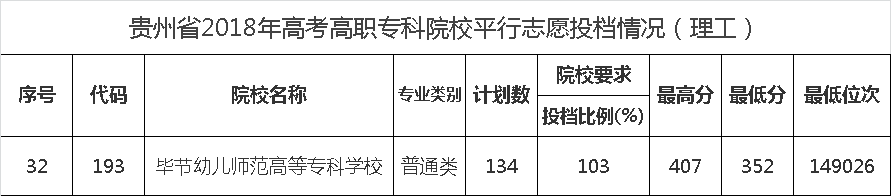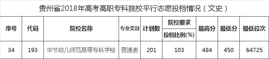 毕节幼儿师范高等专科学校2018年高考平行志愿投档情况