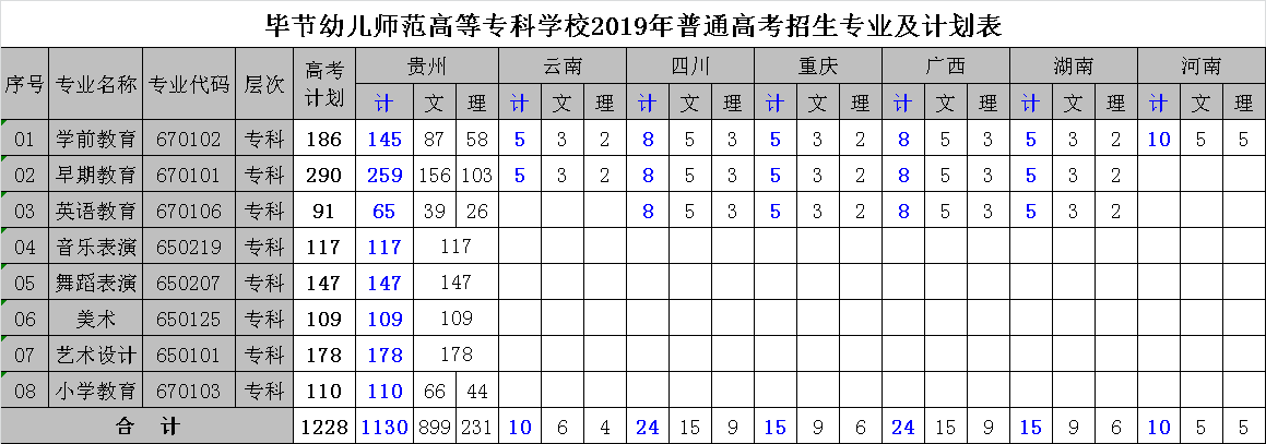 毕节幼儿师范高等专科学校2019年高考招生计划