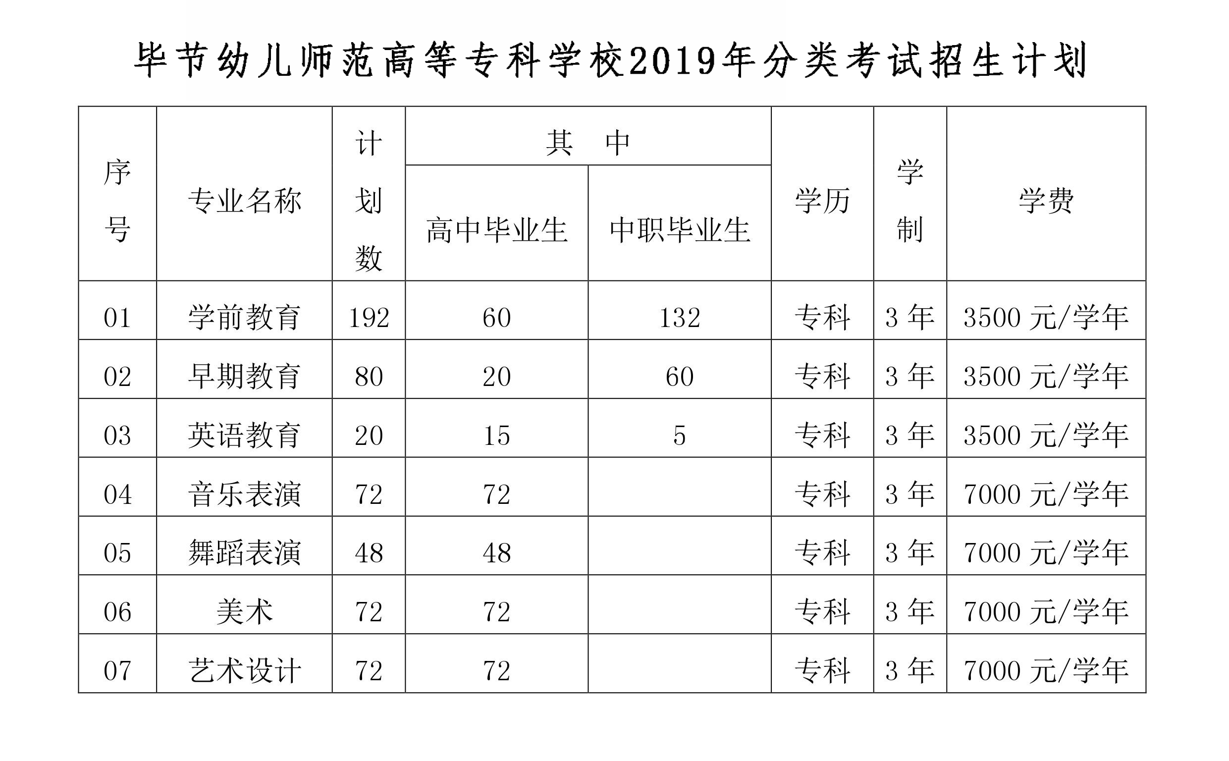 毕节幼儿师范高等专科学校2019年分类考试招生计划