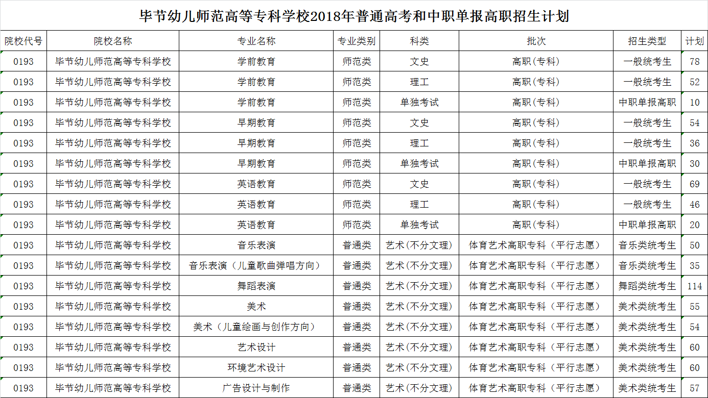 毕节幼儿师范高等专科学校2018年普通高考和中职单报高职招生计划