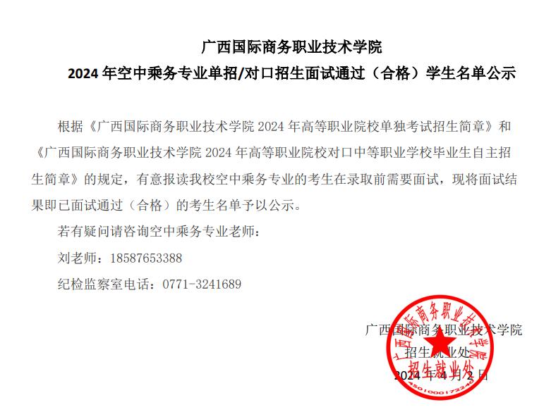 点击查看2024年国商院空中乘务专业单招对口招生面试通过名单公示.pdf