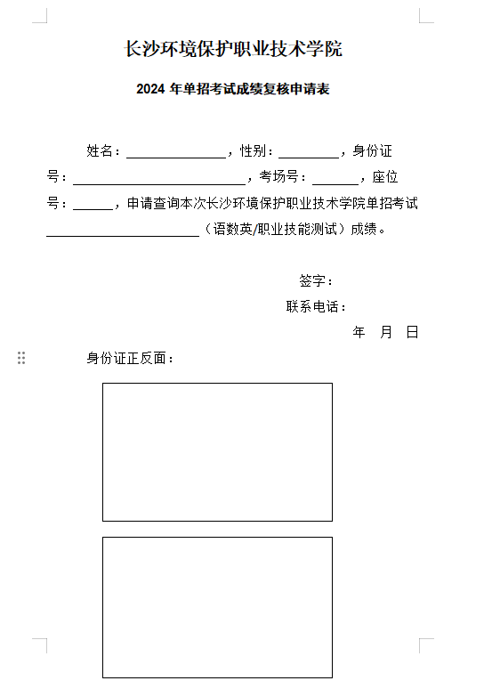 长沙环境保护职业技术学院2024年单独招生考试成绩复核申请表: