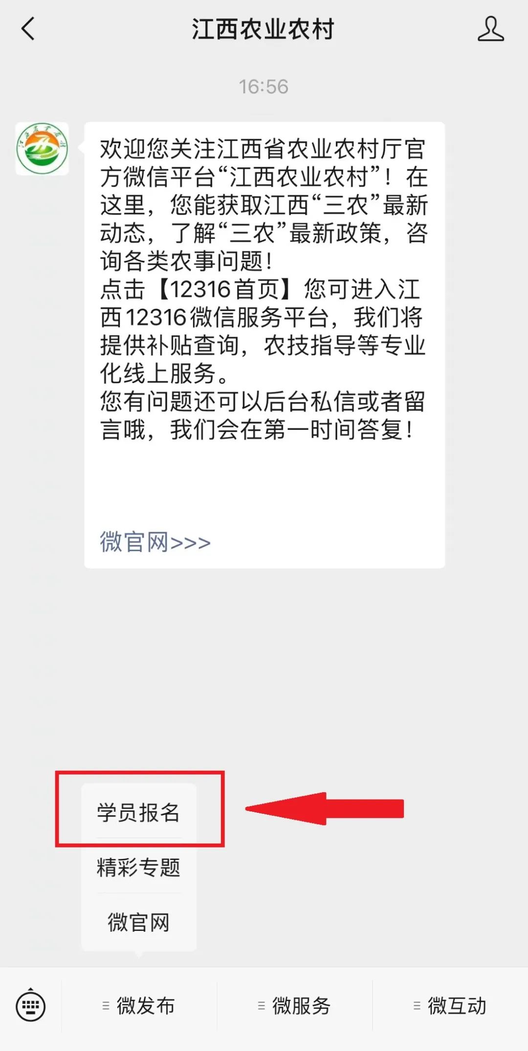 点击底部按钮“微发布”-“学员报名”即可