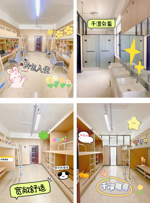 ✮住:舒适便捷的住宿环境学院为学生提供了条件优越的宿舍,每间宿舍均配有独立卫生间、空调和热水器,保证学生的生活舒适度。宿舍楼内设有洗衣房,为学生提供便利的生活条件。宿舍区还配备了24小时安保系统,确保学生的安全。