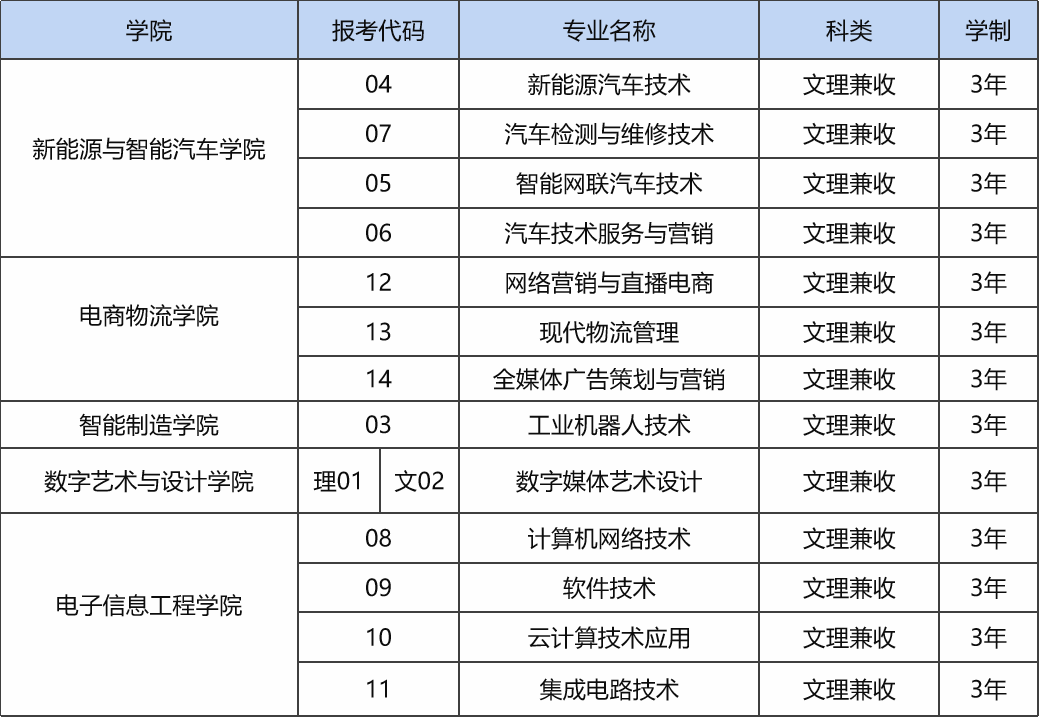 ✮郑州汽车工程职业学院是经河南省人民政府批准、教育部备案的一所普通高等职业院校(招生代码6377)。学院位于河南省省会郑州市,毗邻郑州汽车产业园,交通发达,区域位置优越独特,校园文化气息浓厚,环境优雅、温馨宜人,是莘莘学子学习、生活的理想场所。学院立足郑州,面向河南,辐射全国。依托汽车制造产业,形成以汽车制造与汽车服务类专业为主体,以电子信息技术类和电商物流类专业为两翼的框架结构;培养基础理论扎实、动手能力强、综合素质高、具有创新精神的技术技能型人才。学院办学特色明显,专业优势突出,是河南省第一所建在产业园区的汽车类高等职业院校,把课堂搬到了工厂车间和生产一线,真正实现了“前厂后校”“校中厂、厂中校”办学模式。现设有五个二级学院、 十多个专业,所有专业都围绕汽车产业开设,每个专业都高度契合河南省汽车及装备制造等产业发展需求。✮学院与比亚迪、宝马、大众、丰田、华为、京东等世界著名 企业开展深度校企合作,共同培养汽车产业类、电子信息技术和电商物流类需要的技术技能型人才,彰显郑州汽车工程职业学院的国际化特色。✮学校2024年设置新能源与智能汽车学院、电子信息工程学院、电商物流学院、智能制造与数字艺术设计学院五个二级学院,开设13个特色专业(详细专业见表1)。学院注重理论与实践相结合,开设了丰富的专业课程和实训项目,涵盖汽车制造、维修、检测、新能源汽车技术等多个领域。通过与行业前沿接轨的课程设置,培养学生的专业技能和创新能力。