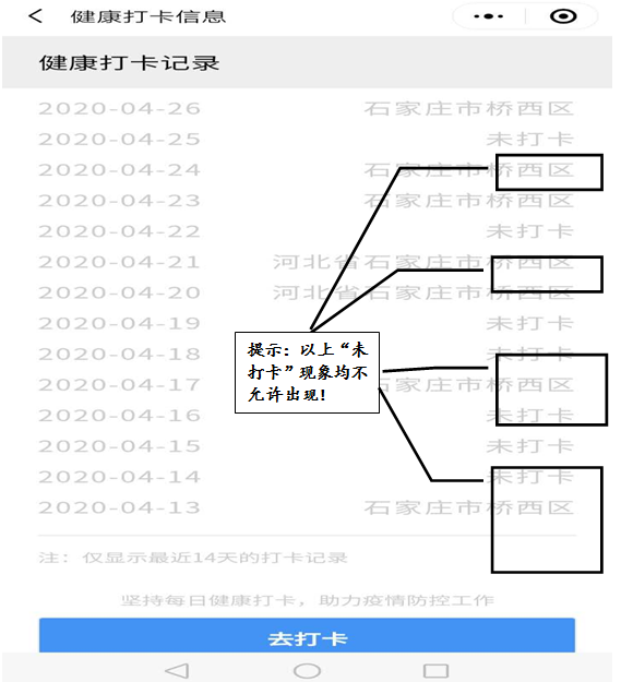 根据学院“所有学生未经允许,均不得返校”的要求,结合我校考生报考实际情况,请所有考生必须提前通过微信搜索“冀时办”下载“河北健康码”,如实填写个人信息,并连续打卡上报考前14天体温,考生进入考点时,须出示打印的“河北健康码”以及14天健康记录(见附件)。未出示“河北健康码”(含14天健康记录)的考生,不得进入考点参加考试。进入考点时,必须测量体温,对体温超过37.3℃的考生进行复检,仍超过37.3℃的,进入备用考场考试。离鄂离汉及从其他中高风险地区返回人员按照防疫要求,还须出具两次核酸检测和一次血清检测报告。