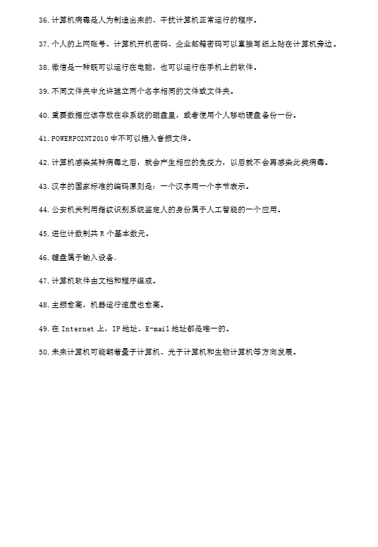 3 | 职业素养及专业技能 | 1.计算机的基本知识:了解计算机的产生和发展,数据处理方式,计算机系统组成,计算机常用组件,软、硬件系统; 2.Windows操作系统的功能、常用的操作系统,掌握操作系统的使用; 3.文字处理软件word(掌握文档的创建、文档操作、编辑、格式化、表格的创建及处理、对象的插入及编辑、文档页面设置及打印); 4.电子表格软件excel(掌握excel文档的创建、数据的输入、表格的美化、常用公式及函数、数据的排序和筛选、页面设置与打印); 5.演示文稿Powerpoint(掌握幻灯片的创建、对象插入、外观设计、切换、动画制作、超级链接等); 6.计算机网络基础知识(了解网络的定义与功能、分类、常用的网络协议、体系结构、常用网络硬件、通信设备、网络软件、Internet使用基础知识)。 | 90% |