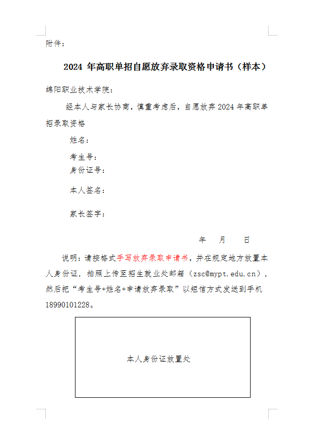 附件:2024年高职单招自愿放弃录取申请书(样本)