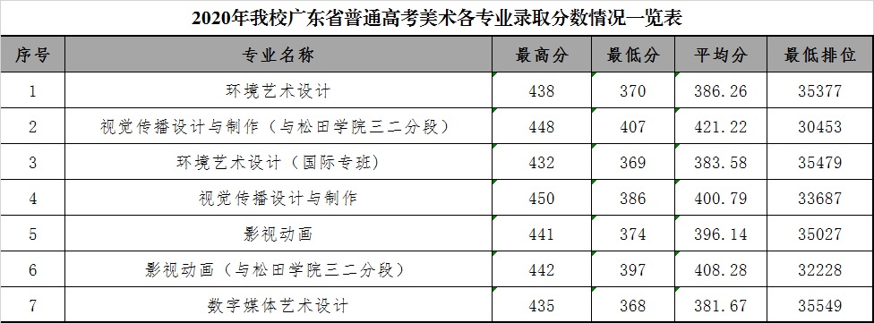 2020年我校广东省普通高考美术各专业录取分数情况一览表