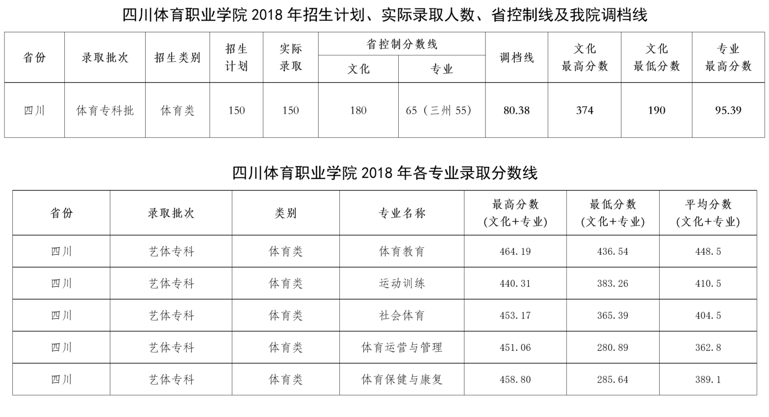 四川体育职业学院2018年招生录取数据统计表