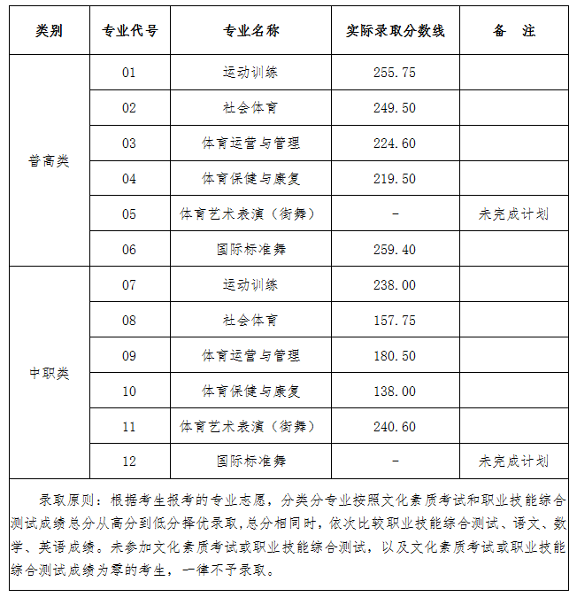 根据《四川省高等教育招生考试委员会 四川省教育厅关于做好2023年普通高等学校高职教育单独招生工作的通知》(川招考委[2023]2号)和《四川体育职业学院2023年高职单招章程》规定,现将今年我院高职单招各类各专业录取分数线公示如下。