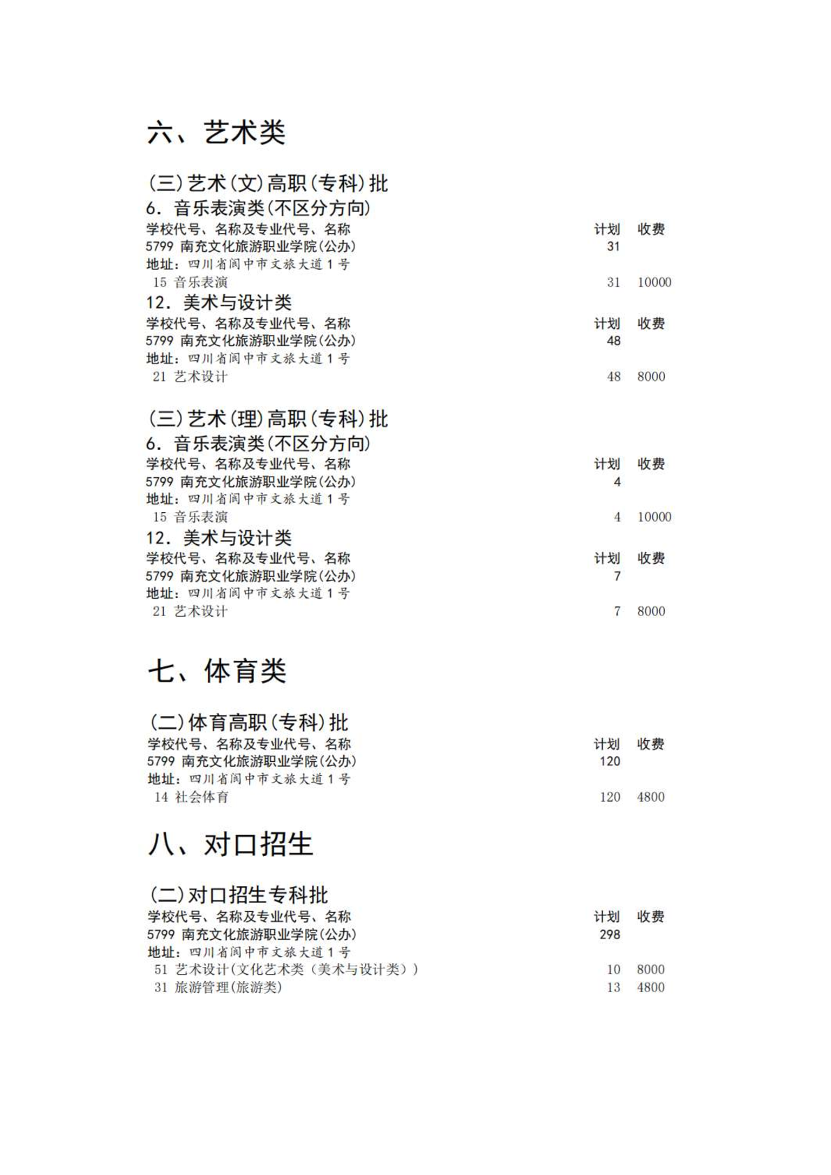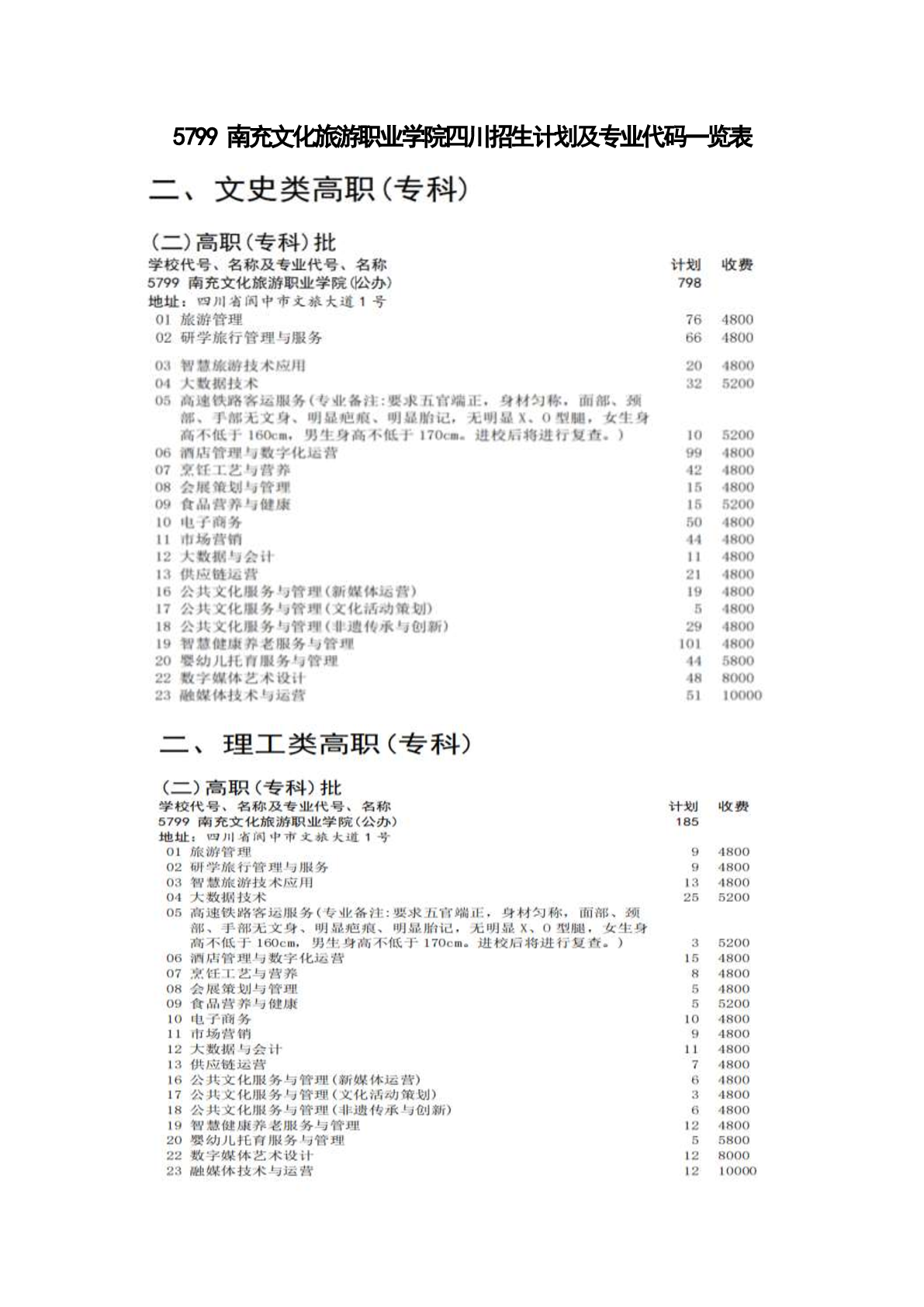 5799 南充文化旅游职业学院四川招生计划及专业代码一览表
