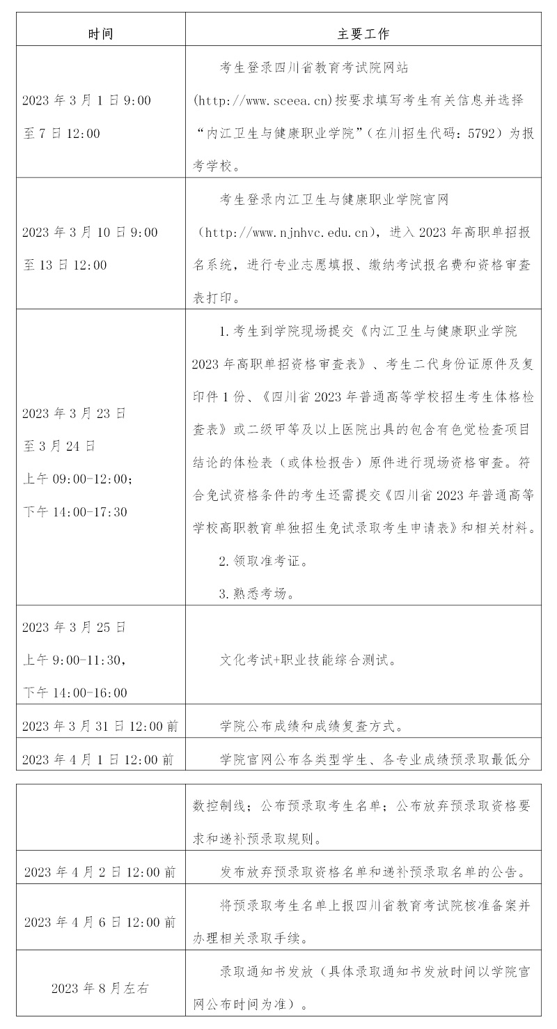 一、总则 根据《四川省高等教育招生考试委员会 四川省教育厅关于做好2023年普通高等学校高职教育单独招生工作的通知》(川招考委〔2023〕2号)文件精神,为确保我院2023年普通高等学校高职教育单独考试招生(以下简称“高职单招”)工作的顺利进行,结合我院实际情况,特制订本章程。本章程适用于我院2023年高职单招考试及录取工作。 二、学校概况 1.学院名称:内江卫生与健康职业学院 2.办学属性及层次:公办高职专科 3.在川招生代码:5792 4.办学地址:四川省内江市东兴区汉安大道东四段368号 三、组织保障 学院高职单招工作坚持公平、公正、公开原则,健全自我约束、社会监督机制,强化招考行为规范,严格实施招生“阳光工程”。 (一)我院2023年高职单招工作接受省招考委、省委教育工委、教育厅和省教育考试院的指导和监督;在学院高职单招工作领导小组领导下进行。 (二)学院成立以院长为组长,纪委书记、分管招生、教务、后勤的副院长为副组长,招生、教务、纪检监察、后勤保障、安全保卫等部门负责人为成员的高职单招工作领导小组,集体研究决定高职单招考试、录取过程中的重大问题。高职单招工作领导小组下设四个工作组。学校纪检监察部门对高职单招工作进行全过程全方位监督。 1.笔试及职业技能综合测试考核小组:负责笔试试卷领取、保密、编排考场、组织考试、评卷、汇总成绩;负责职业技能综合测试的题目制作,标准制定,流程确定,组织考核,汇总成绩,复核查询成绩等。 2.招生录取小组:负责高职单招宣传,报名、信息核实、报名资格审查,准考证发放、新生录取,办理录取手续、通知书发放等。 3.后勤安全、财务小组:负责后勤、医疗保障、疫情防控,考场秩序和安全保卫、考生考试报名费管理等。 4.纪检监察小组:负责高职单招工作进行全过程全方位监督。保证考试,录取工作公平、公开、公正。 (三)学院纪检监察部门对本次高职单招工作进行全过程全方位监督,并接受考生、家长和社会监督。凡有直系亲属(父母、配偶、子女、兄弟姐妹等)报考学院的教职工,不得参加当年招生工作。 四、报考条件和报考类别 (一)报考条件 1.已参加2023年四川省普通高等学校招生报名,且符合我院招生条件的考生。 2.遵守中华人民共和国宪法和法律。 3.身体健康状况必须符合《普通高等学校招生体检工作指导意见》及有关补充规定。特别提醒:因医药卫生类专业的特殊性,轻度色觉异常(俗称色弱)、色觉异常II度(俗称色盲)学院有关专业可以不予录取。 (二)报考类别 1.普高类:高中文科和理科毕业生。 2.中职类:医药卫生类专业中职毕业生。 五、报名方式及报名时间 2023年高职单招报名实行网上统一填报的方式,分网上报名和学校确认两个阶段。网上报名和学校确认完成后,须按要求到学院进行现场报名资格审核。 (一)网上报名阶段(填报学校志愿) 考生于2023年3月1日9:00至7日12:00,登录省教育考试院网站(https://www.sceea.cn),按要求准确填写考生有关信息,并且填报1个学校志愿。在规定的报名时间范围内,考生可以修改学校志愿。逾期不再补报,也不得再修改填报的学校志愿。因考生本人疏漏或失误造成的错误填报结果由考生本人承担。 (二)学校确认阶段(填报专业志愿) 考生于2023年3月10日9:00至13日12:00,登录内江卫生与健康职业学院官网(http://www.njnhvc.edu.cn),进入2023年高职单招报名系统,按系统提示完成个人信息真实准确填写、专业志愿填报和缴纳考试报名费等环节。凡是未在规定时间范围内完成专业填报和缴费的考生视为自愿放弃学院2023年高职单招考试报名。考试报名费缴纳成功且报名成功以后,考试报名费不予退费。 1.考生根据页面提示缴纳考试报名费130元后须及时在报名系统中打印《内江卫生与健康职业学院2023年高职单招资格审查表》,同时在该表上作诚信报考承诺签名。 2.考生在报名时,只能填报一个专业志愿。中职类考生应填报与中职阶段所学专业大类相一致的专业,不得跨类填报。在我院高职单招报名工作结束前,考生可修改专业志愿,报名工作结束后,不可修改专业志愿。 3.由于用人单位的就业岗位要求,身高未达到158cm的女生慎报护理、助产专业。 (三)报名资格审核 学院将对已成功在网上报名并缴费的考生报名资格进行现场审核,资格审核合格后由学院发放《准考证》。所有考生应本着诚信原则如实向学院提供相关材料,如虚报、隐瞒或伪造、涂改等有关材料及其他欺诈手段取得报考高职单招资格的考生,学院将按照相关规定予以取消。 1.考生现场资格审核时间 2023年3月23日至3月24日上午09:00-12:00;下午14:00-17:30。 2.考生现场资格审核地点 内江卫生与健康职业学院招生就业处。 3.考生现场资格审核须提交资料 (1)《内江卫生与健康职业学院2023年高职单招资格审查表》(需考生本人签字); (2)考生二代身份证原件及复印件一份; (3)《四川省2023年普通高等学校招生考生体格检查表》或二级甲等及以上医院出具的包含有色觉检查项目结论的体检表(或体检报告)原件。 4.免试生现场资格审查注意事项 (1)申请免试资格考生须符合以下条件。 在校期间参加由教育部主办或联办的全国职业院校技能大赛获得一、二、三等奖和由省级教育行政部门主办或联办的全省职业院校技能大赛获得一等奖的中职应届毕业生,和具有高级工或