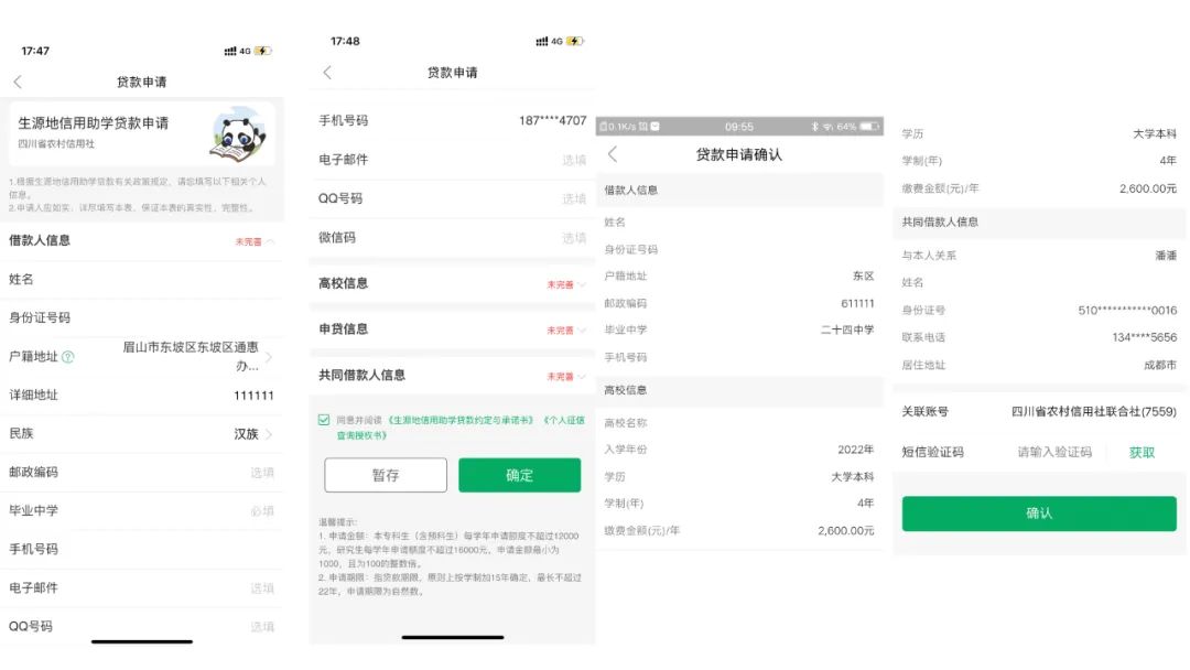 填写个人基本信息、共同借款人信息,提交贷款申请并导出《申请表》。系统提示未通过预申请的同学,还需要填写《认定表》。