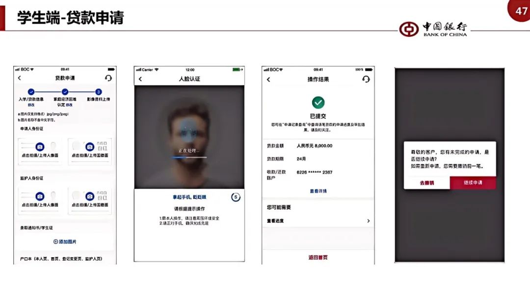 第6步:提交申请后,等待县级学生资助管理部门对学生的家庭经济困难情况进行审核,审核通过后,进入中国银行审批环节,中国银行审批通过后,会通过短信通知审批结果及入学验证码。审批通过后,学生可进入手机银行签署贷款合同。
