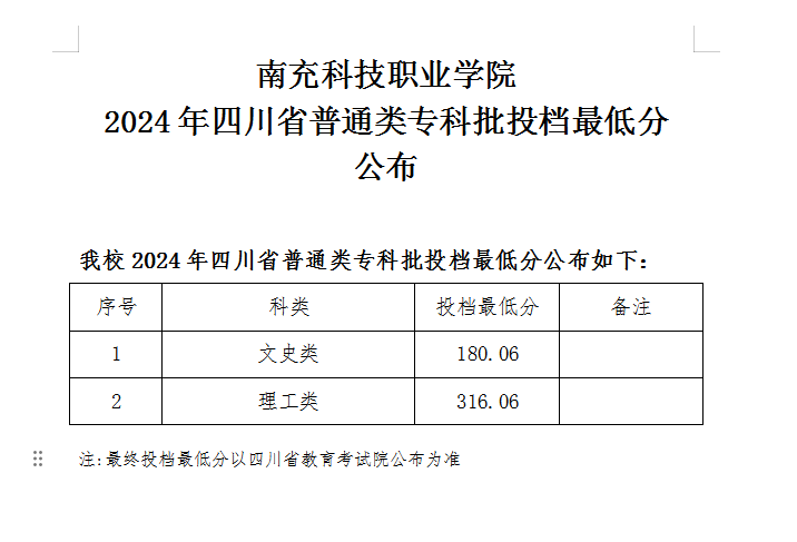 南充科技职业学院2024年四川省普通类专科批投档最低分 公布