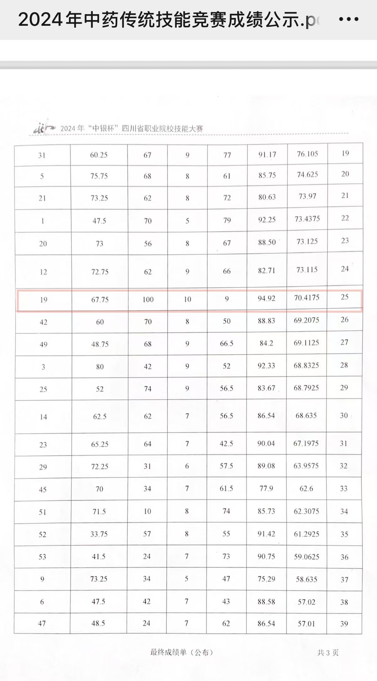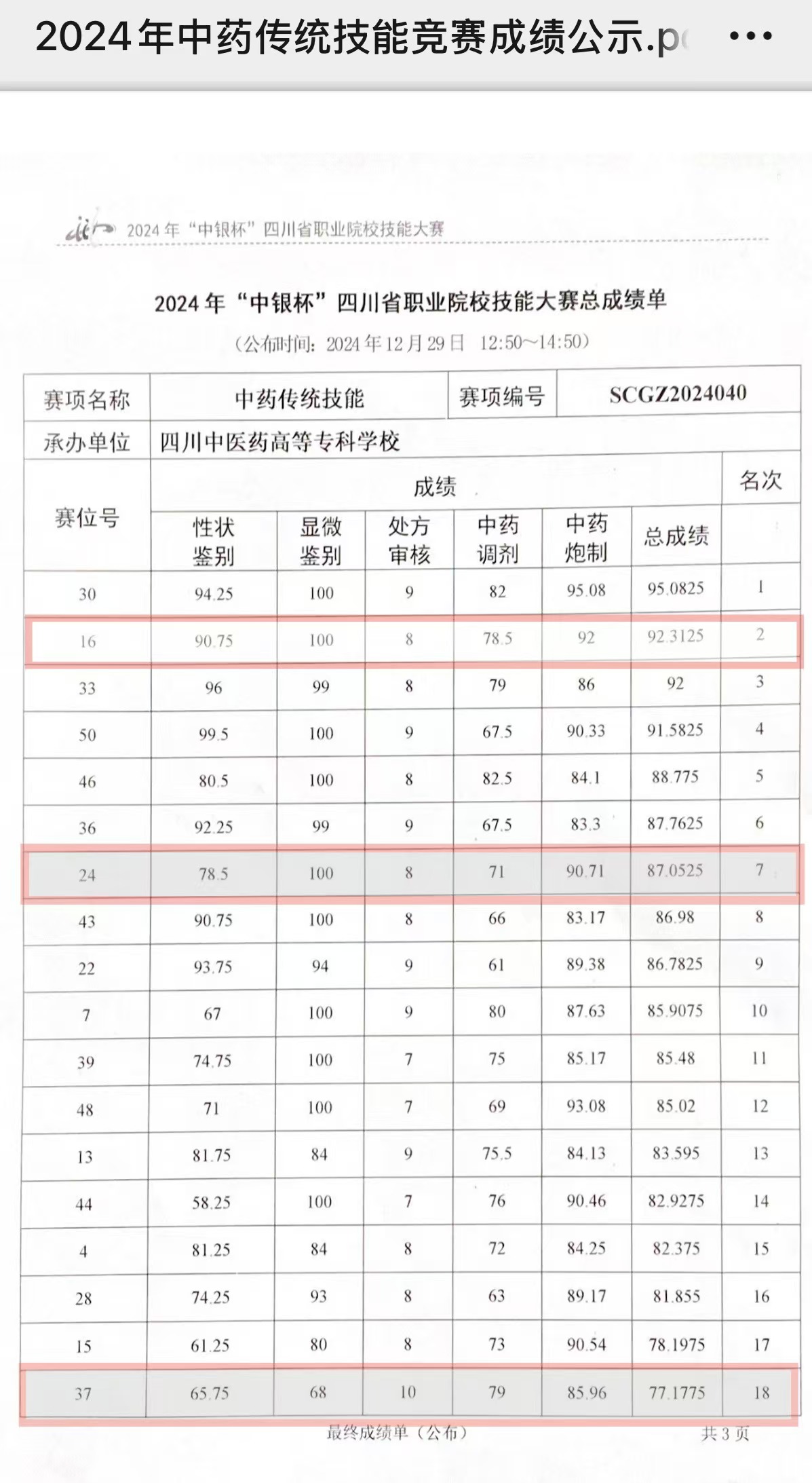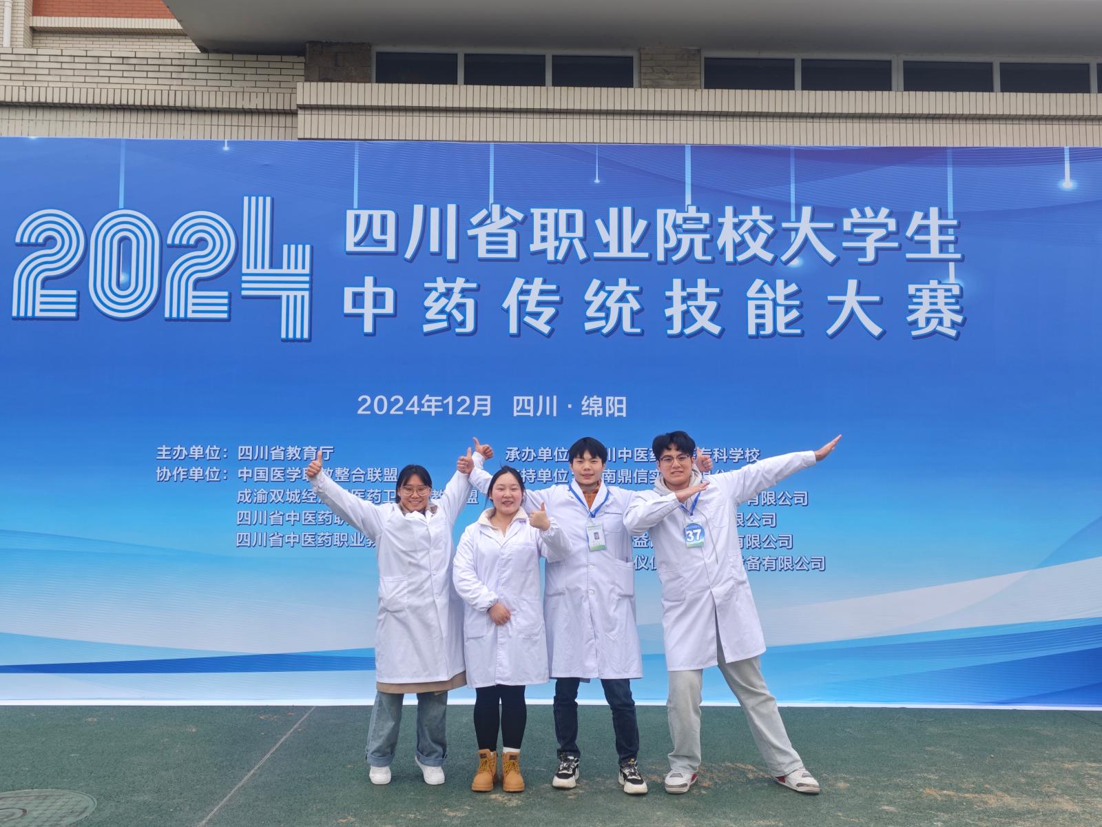 近日,在2024年“中银杯”四川省职业院校技能大赛(高职组)中药传统技能赛项比赛中,我校中药学专业学生杜丽君、张菊、王誉丹、李洋过关斩将,表现突出,经过性状鉴别、显微鉴别、审方调剂和中药炮制等多个环节的激烈角逐,最终从来自全省14所高职院校的53名参赛选手中脱颖而出,4名学生全部获奖,其中斩获一等奖1项,二等奖1项,三等奖2项。