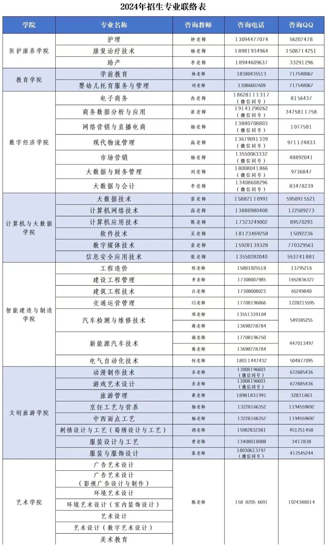 各专业咨询联络方式