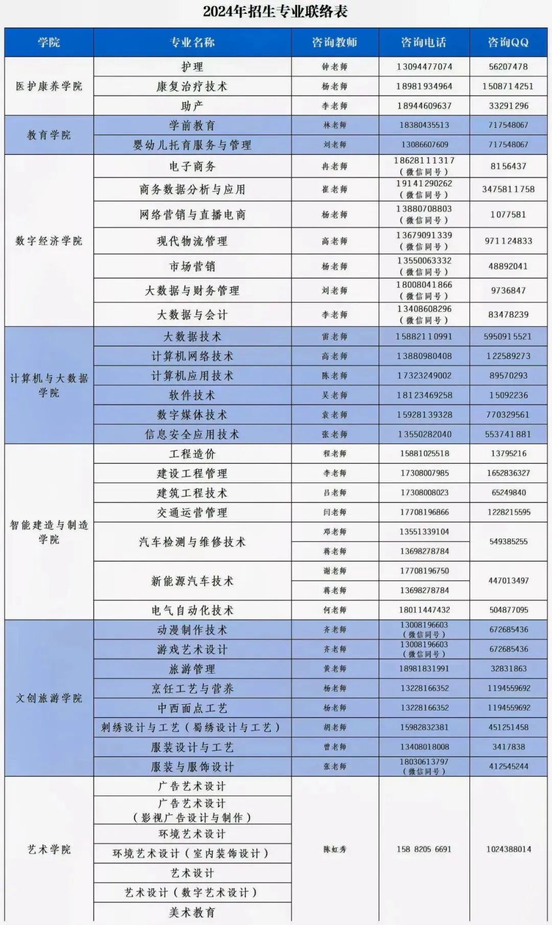 各专业咨询联络方式