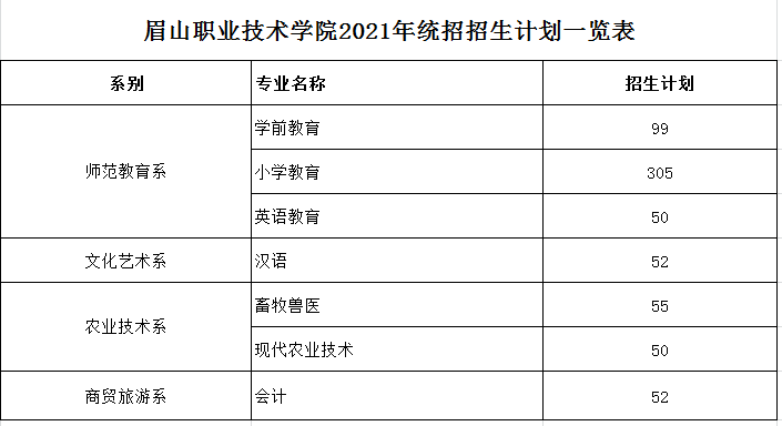 眉山职业技术学院2021年统招招生计划一览表