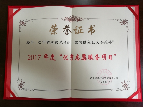 2017年12月,系部“温暖进社区义务维修活动”被巴中市精神文明办公室授予2017年度“优秀志愿服务项目”。