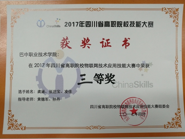 2017年4月,参加2017年四川省高职院校物联网技术应用技能大赛,荣获三等奖。
