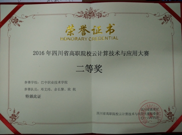 2016年4月,参加2016年四川省高职高专云计算技术与应用大赛,荣获二等奖以及信息安全管理与评估技能大赛荣获优秀奖。