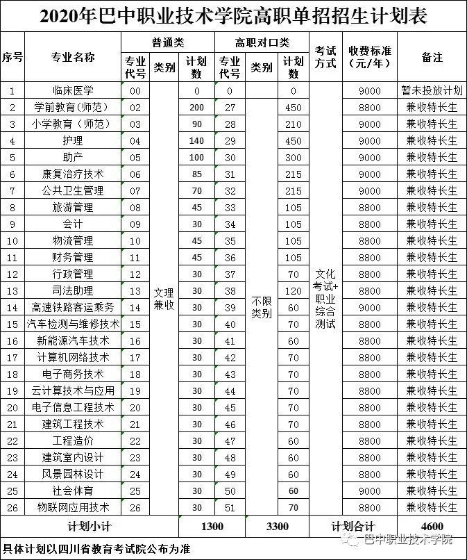 大多数同学选择单招,不正是因为单招更容易考上自己理想的学校么?巴中职业技术学院2020年单招计划4600名,录取几率较大。