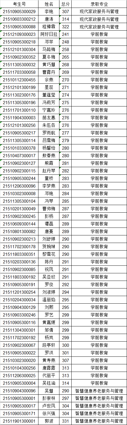 根据《四川省2021年高职扩招专项工作招生考试及录取办法》和《川南幼儿师范高等专科学校2021年高职扩招招生章程》,我校于2021年12月11日由学校自主命题组织对报考我校的考生进行高职扩招考试,经学校招生工作领导小组研究决定,参考考生总成绩达到210分以上的同学予以录取,拟录取55名考生。