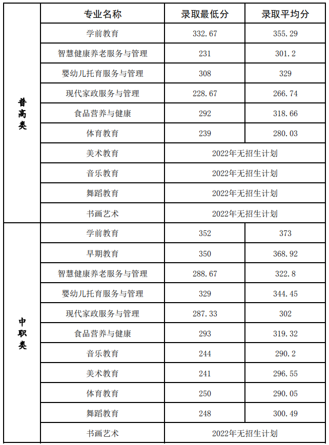 川南幼专2022年单招考试各专业录取分数线