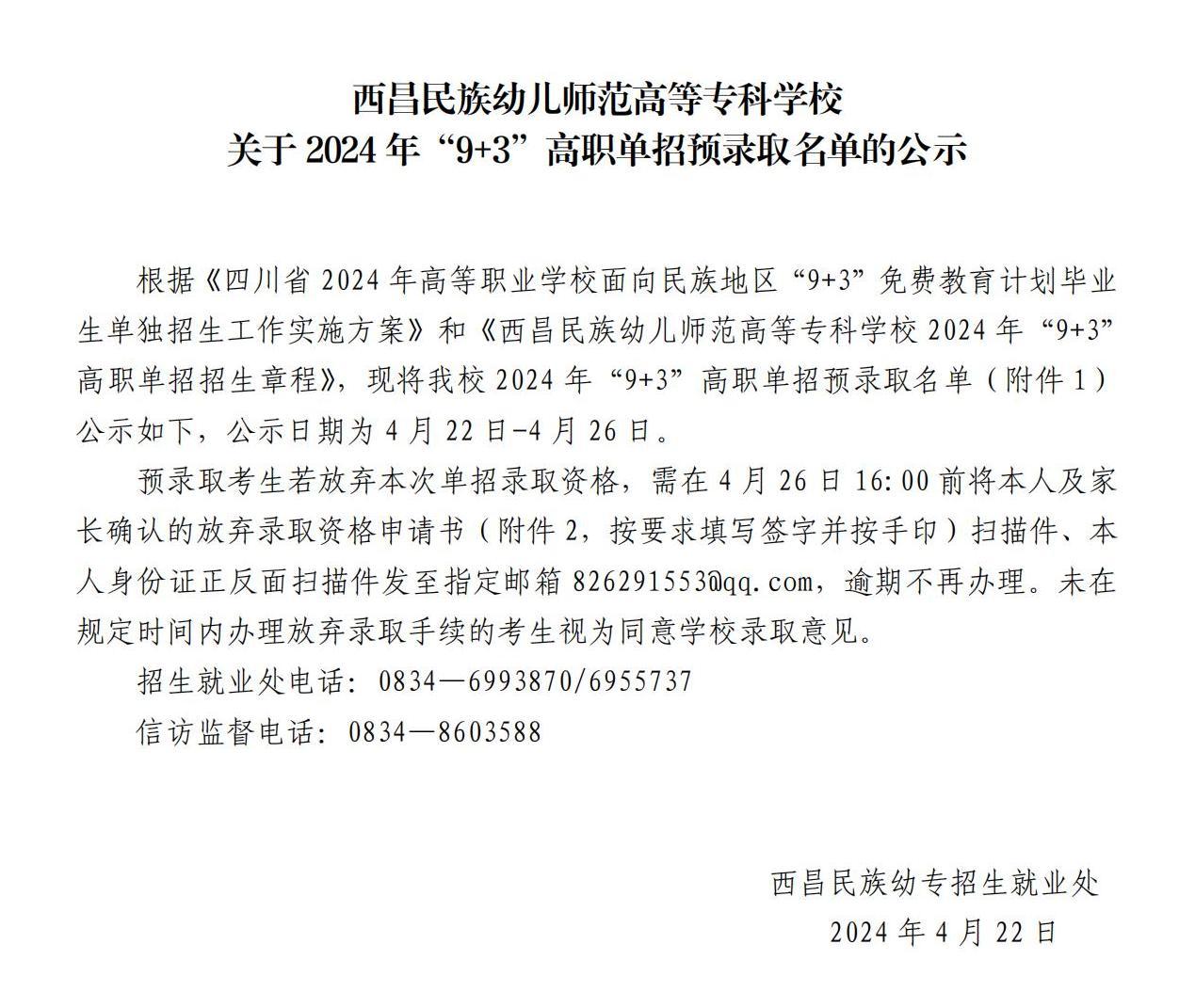 附件1:西昌民族幼专2024年“9+3”高职单招预录取名单.pdf