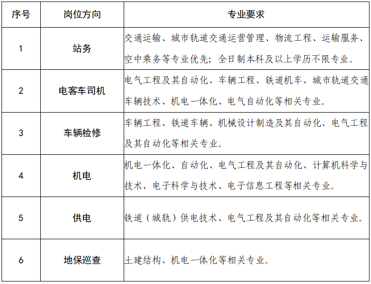 5.身高条件:站务岗位男生不低于165cm,女生不低于158cm;电客车司机岗位不低于163cm;其他岗位方向男生不低于160cm,女生不低于150cm。