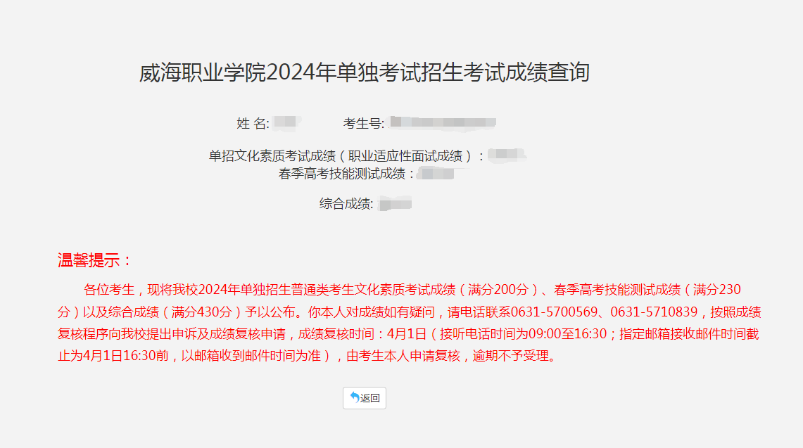 温馨提示:各位考生,现将我校2024年单独招生普通类考生文化素质考试成绩(满分200分)、春季高考技能测试成绩(满分230分)以及综合成绩(满分430分)予以公布。你本人对成绩如有疑问,请电话联系0631-5700569、0631-5710839,按照成绩复核程序向我校提出申诉及成绩复核申请,成绩复核时间:4月1日(接听电话时间为09:00至16:30;指定邮箱接收邮件时间截止为4月1日16:30前,以邮箱收到邮件时间为准),具体申诉及成绩复核申请流程详见我校官方招生信息网(https://www.whvc.edu.cn/zhaosheng)“单招综评”栏目里面的相应文件。