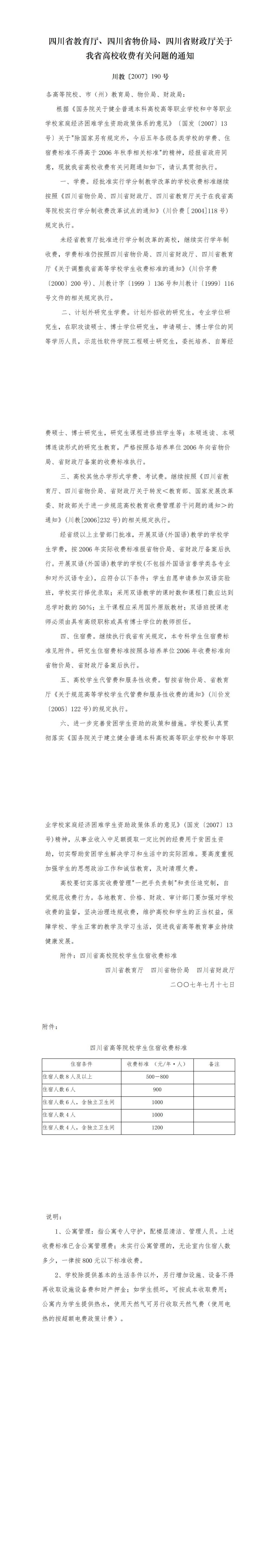 四川省教育厅、四川省物价局、四川省财政厅关于我省高校收费有关问题的通知(川教[2007]190号)