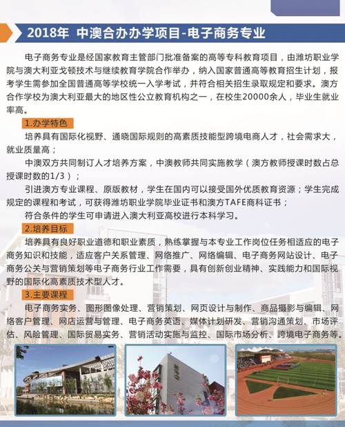 1.电子商务(中外合作办学)专业是与澳大利亚戈顿技术与继续教育学院合作办学专业。“双师”教学、国内就读,拿国际认可的国内外双文凭;学分互认,轻松实现国际专升本硕;中西合璧,熟练掌握专业技能和英语技能。