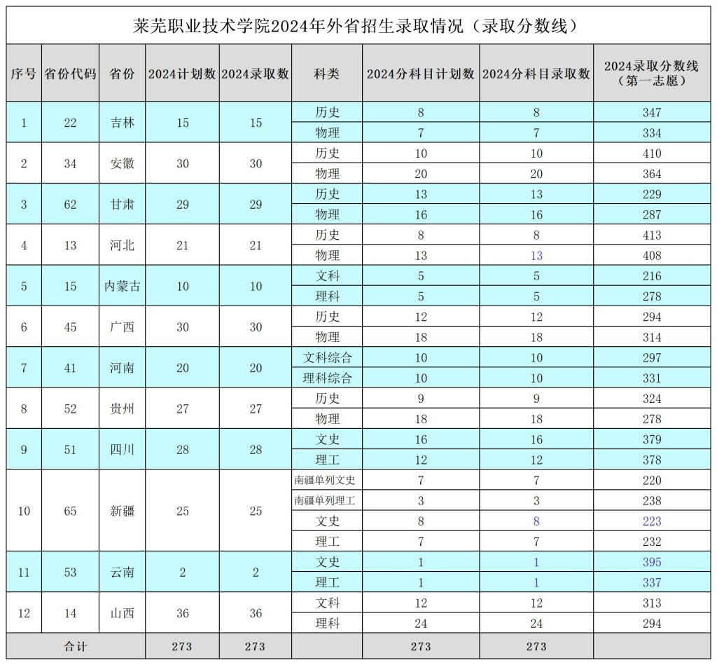 莱芜职业技术学院2024年外省招生录取情况(录取分数线)