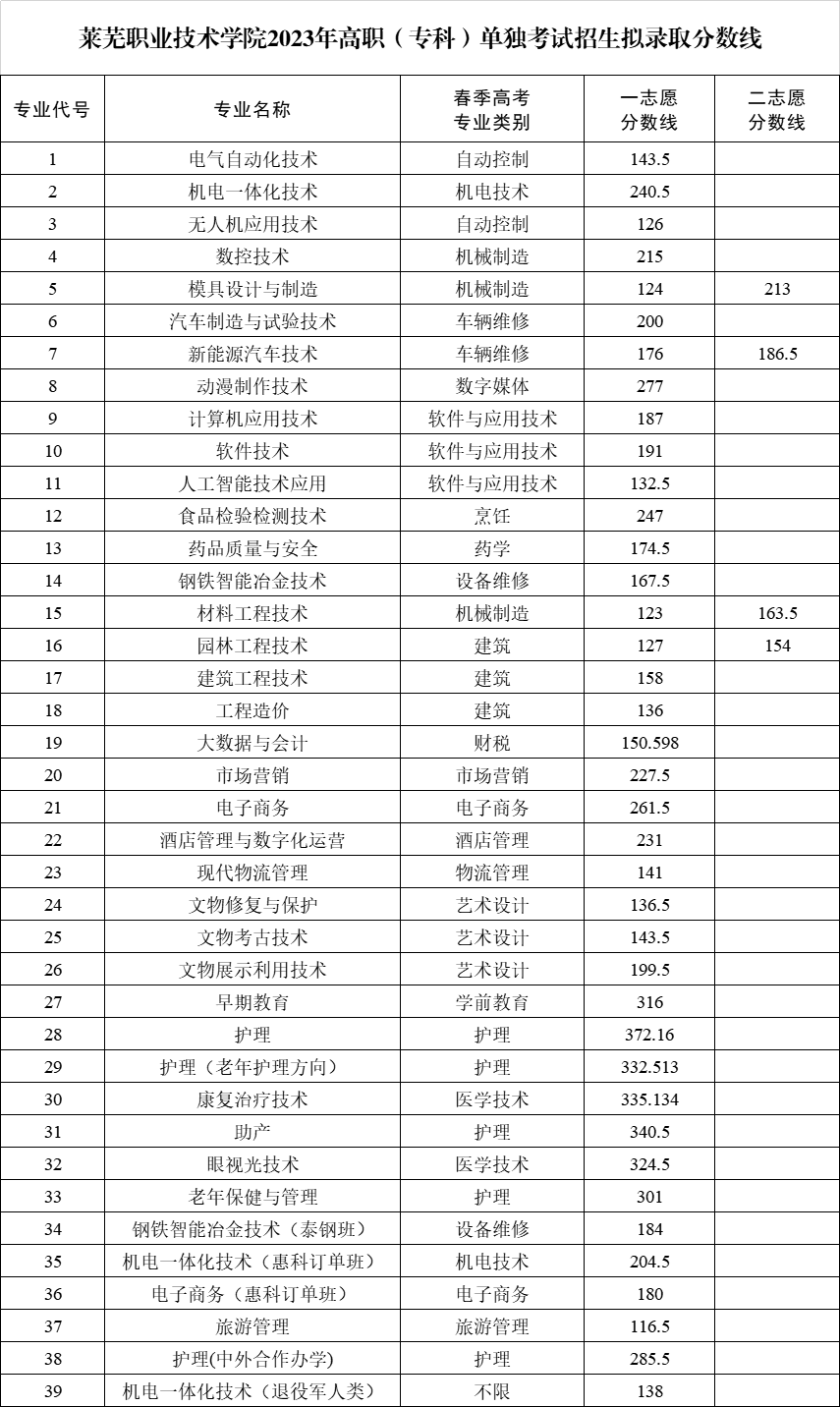 莱芜职业技术学院2023年单独考试招生拟录取分数线