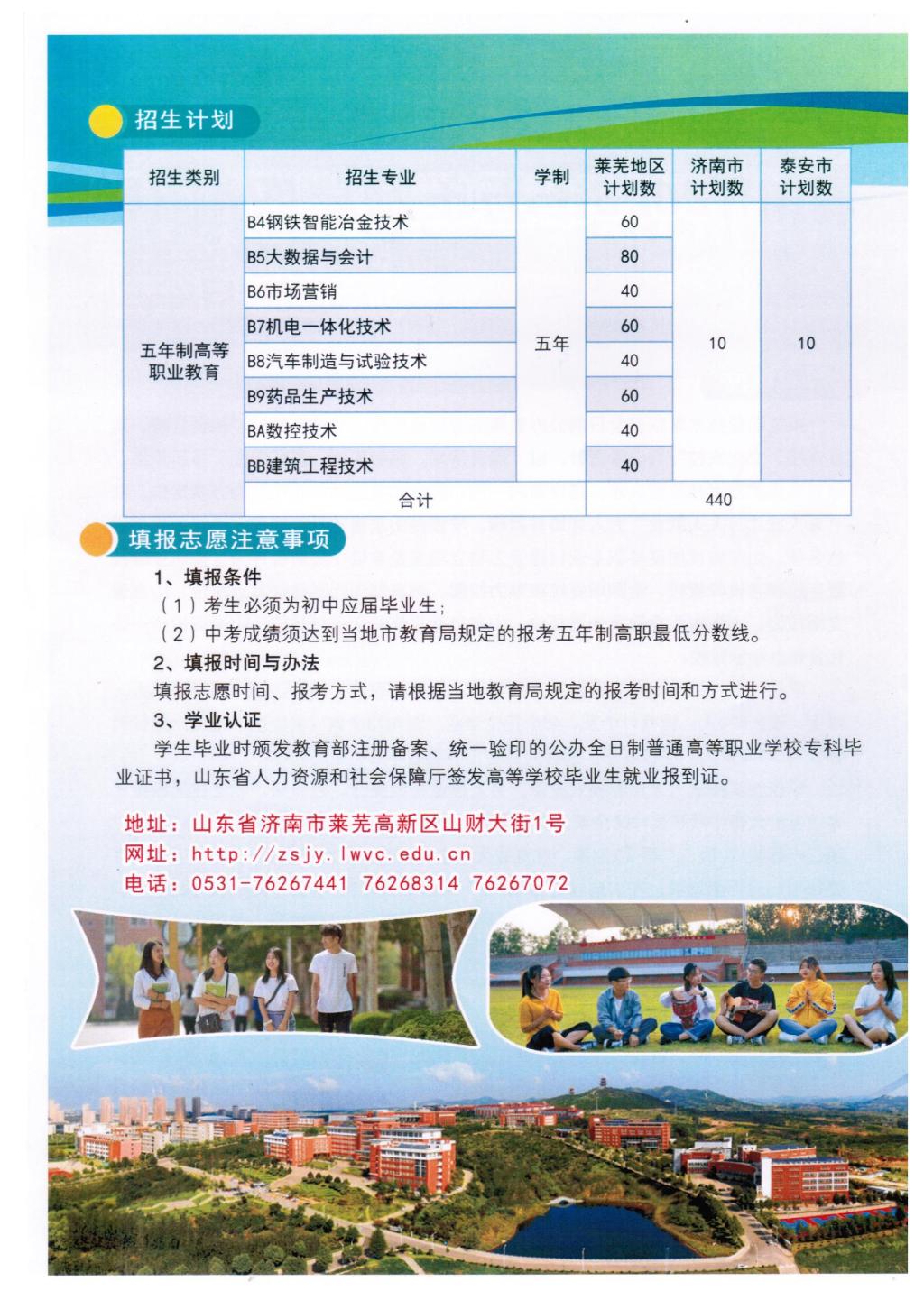 莱芜职业技术学院2023年五年制高等职业教育招生计划
