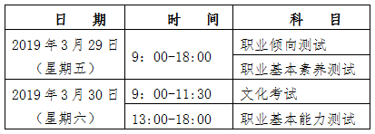 我院2019年单招综合素质测试由职业倾向测试、职业基本素养测试、职业基本能力测试三部分组成,总分200分。测试具体安排如下: