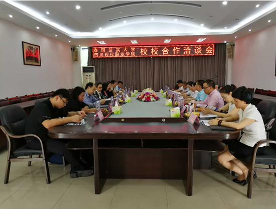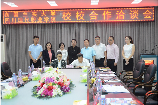座谈会结束后,四川现代职业学院和泰国兰实大学签订了校校合作协议。 兰实大学艺术学院、国际学院、中泰合作交流处、驻四川办事处等泰方人员一同访问我院。我招生考试处处长吴金林、学生处处长程勇、制造技术系系主任韩立、商务旅游系系主任彭立力、财经系系主任任欣、建筑法律系系主任邓建辉参加会见。