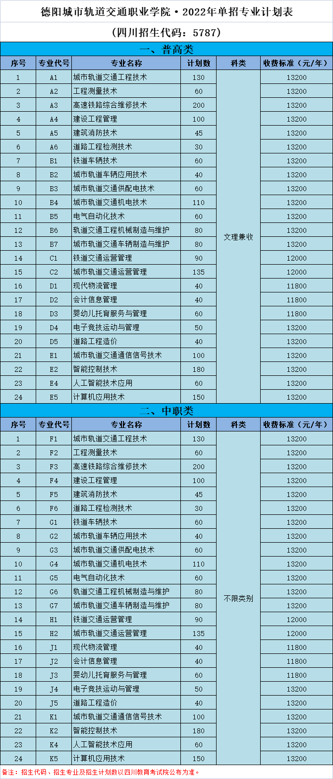 德阳城市轨道交通职业学院·2022年单招专业计划表