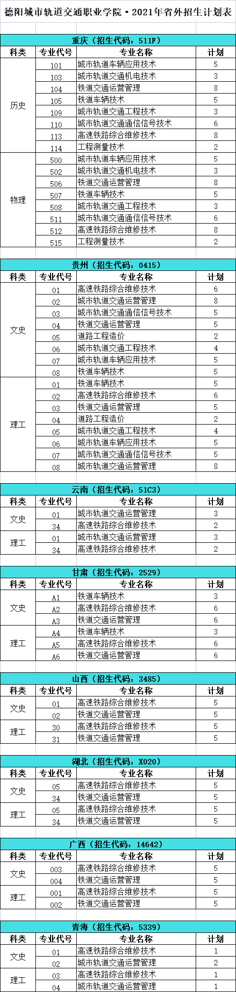 德阳城市轨道交通职业学院·2021年招生计划总表
