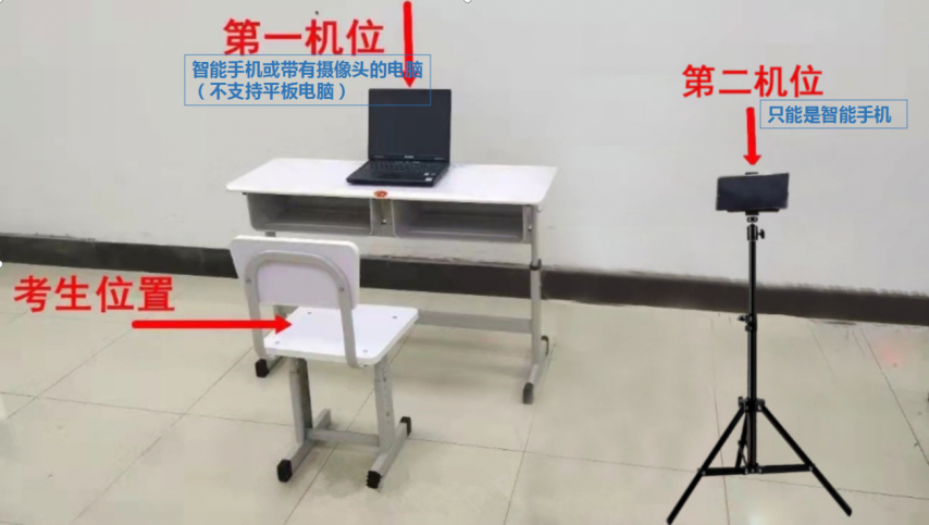 ↑ ↑ ↑以上为Android下载二维码2、安装时,请授权允许“云考AI”使用您的摄像头、麦克风、扬声器、存储空间、网络等权限,以保证可以正常考试。电脑也需要打开摄像头和麦克风权限。设置方法:电脑设置-隐私设置-打开摄像头和麦克风权限。3、手机“云考AI”仅提供IOS和安卓版本,不支持iPad和各种安卓平板。(四)机位摆放本次考试采取坐姿,双机位同时监考方式。开考后,考生应坐到合适位置,须显示出上半身,双手要放在桌面。考试期间,第一机位用于直接考试答题(单招和综合评价考试考生均采用线上系统内在线作答方式),第一机位摄像头距离人脸30-50厘米,要能拍到考生本人人脸以及上半身;第二机位手机用于监考,该手机放在考生右后(或左后)上方(45度角)150厘米远处,手机位置高于桌面30-40CM(根据个人身高情况可适度调整),手机要横放,与水平面垂直。考生本人身体上半身和第一机位及草稿纸,必须完整的呈现在该手机的监控范围内。特别提示:学院在校内设置监考考场,对每位考生的考试情况进行远程网上即时监考,并全程录像。监考摄像头具有广角功能,监考老师看到的视频比考生现场显示的手机画面实际范围更广。考试过程中切换页面会被系统认定为异常行为,任何舞弊行为都会被监控到,请同学们务必遵守考试纪律。手机摆放位置如图所示:↓ ↓ ↓