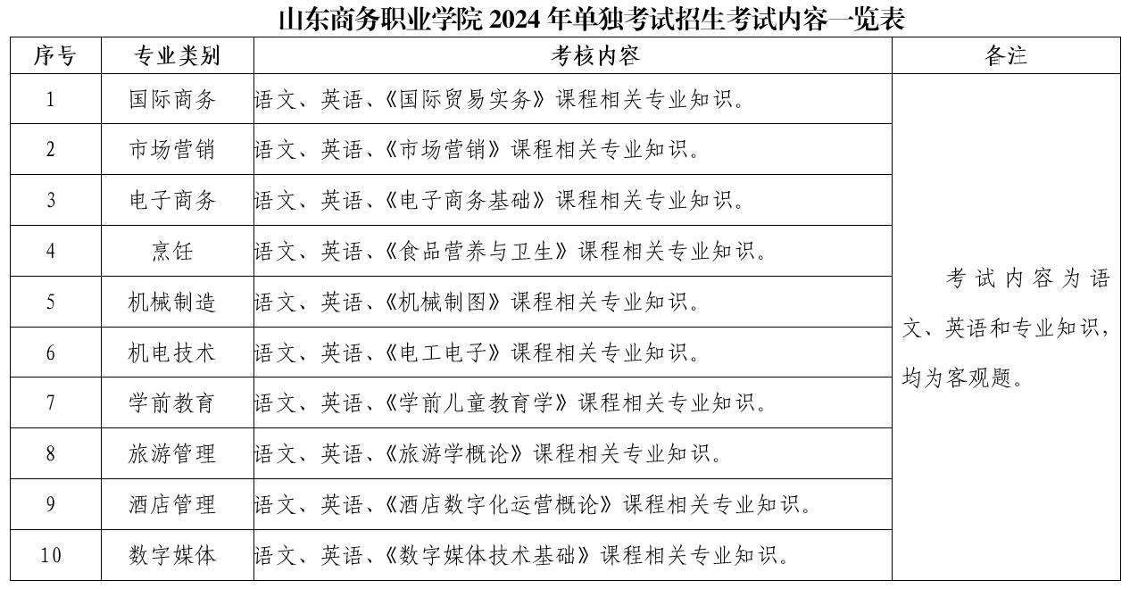 山东商务职业学院2024年单独考试招生考试内容一览表