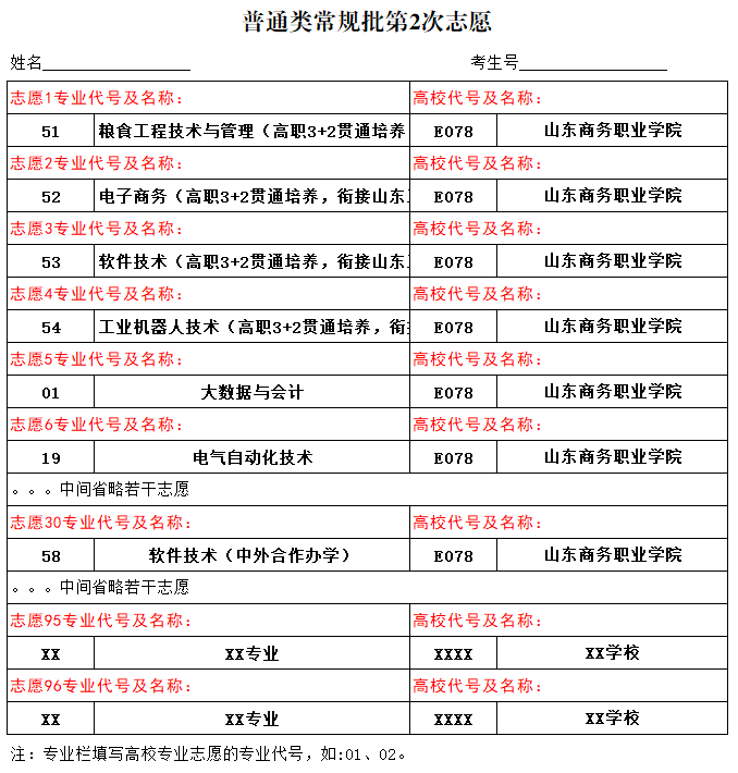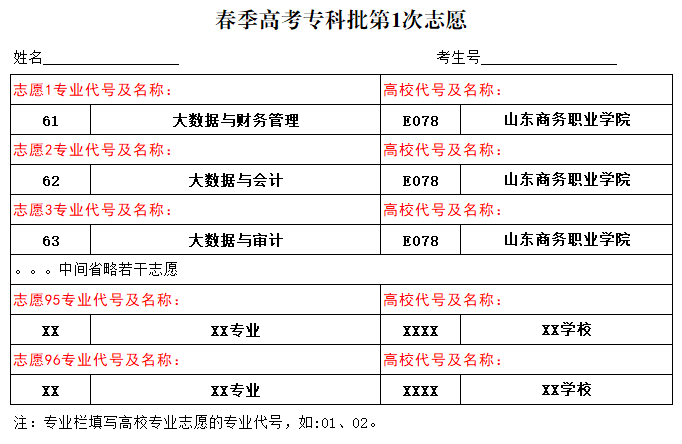 1个“专业(专业类)+学校”为1个志愿,考生每次填报志愿的数量最多不超过96个。考生志愿填报的专业类别须与考生报名和考试的专业类别一致,不能跨专业类别填报志愿。