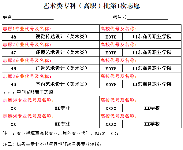 艺术类专科批第1次志愿填报图例