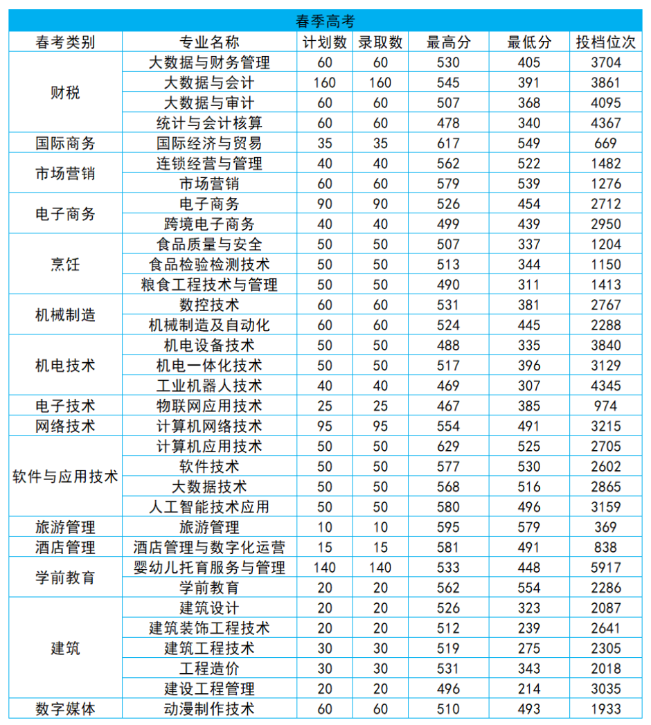 420分以上,报考财会金融类、智能制造类、计算机类以及学前教育类专业,录取希望较大;